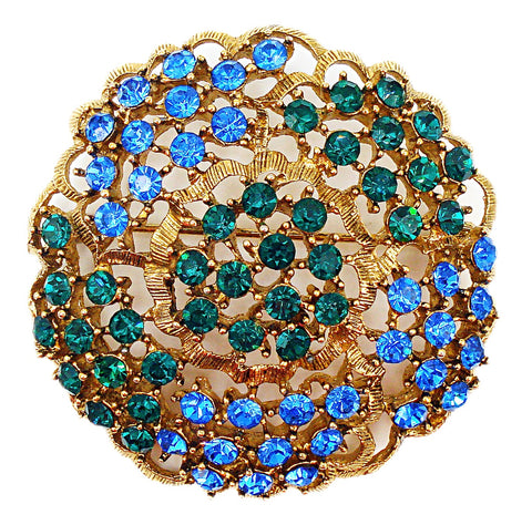 Brooch Majestic 2 1/8" Gold Tone Open Work Crystal Emerald Rhinestones