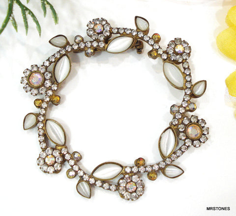Brooch Pin 1 1/2" Heart White Opal Pink Rhinestones Painted Heart Stone