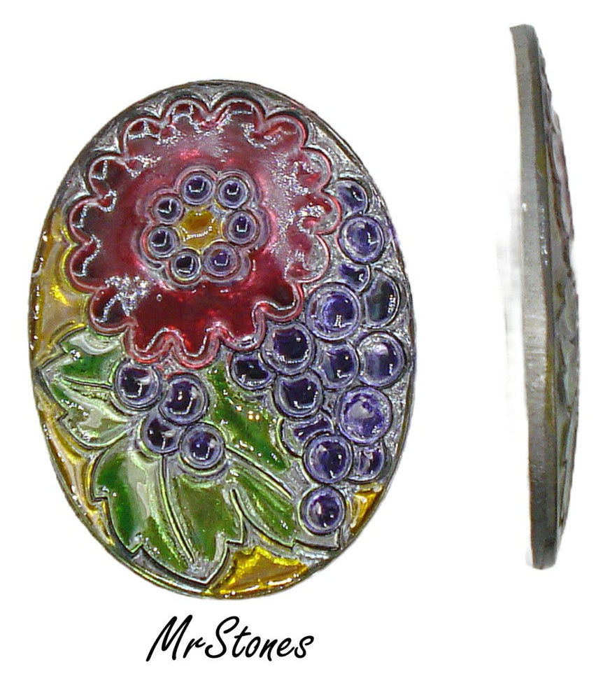40x30 mm (1685) Floral Poured Glass Stained Glass Textured Oval Cabochons. Metal Backing Vintage Glass Stones.