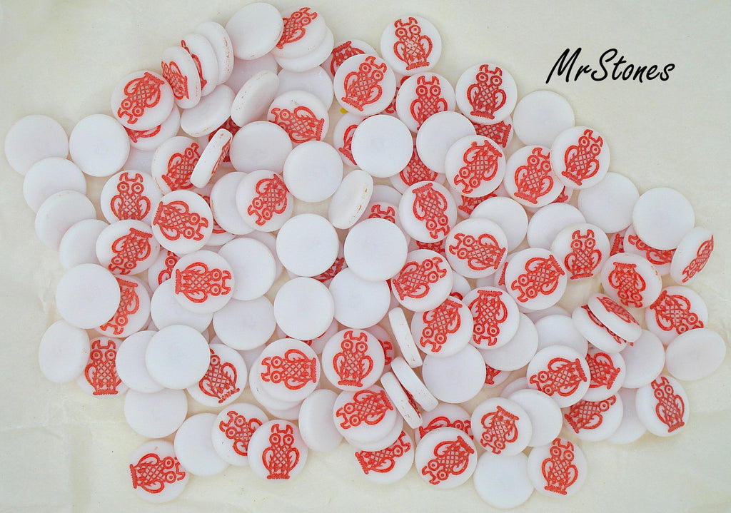 11 mm 11.0 (2194) White with Indented Red Owl Round Disc Cabochon 2.8mm Thick Vintage Glass West Germany Stones.