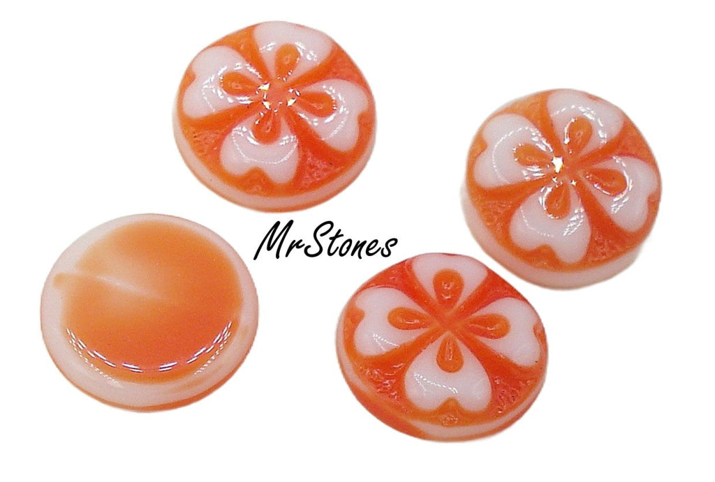 9 mm 9.0 (8.7mm) Round Cabochon Orange with White 4 Leaf Clover Flower West German Vintage Glass Stones.