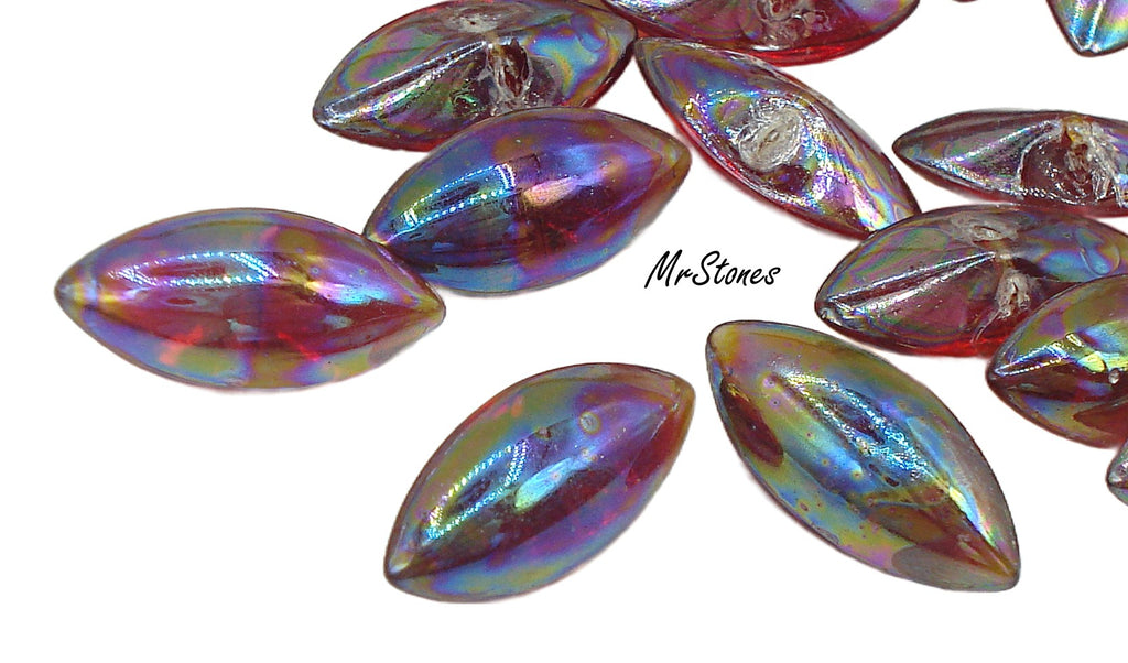 15x7 mm (3146) Iridescent Ruby AB Marquise Navette Buff Top Doublet w/Bead Holes Vintage Glass Stones.