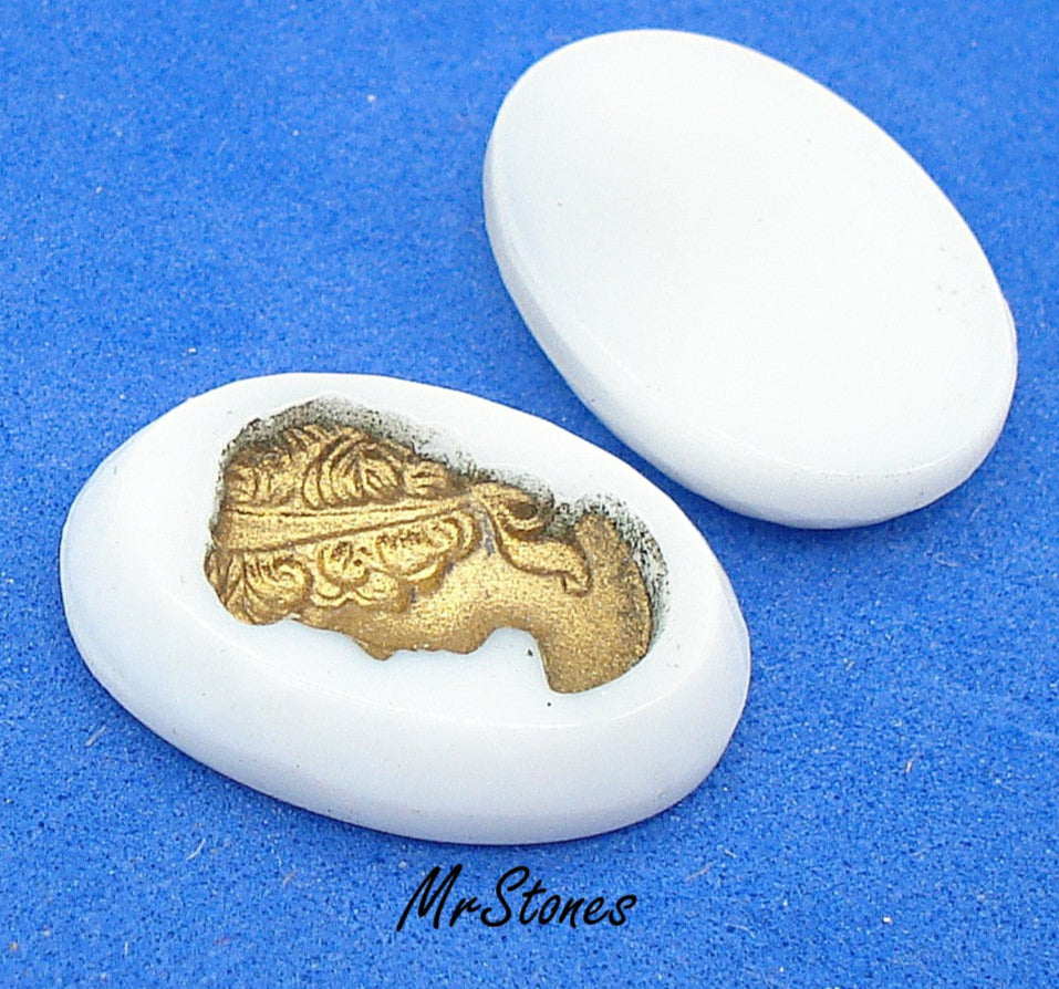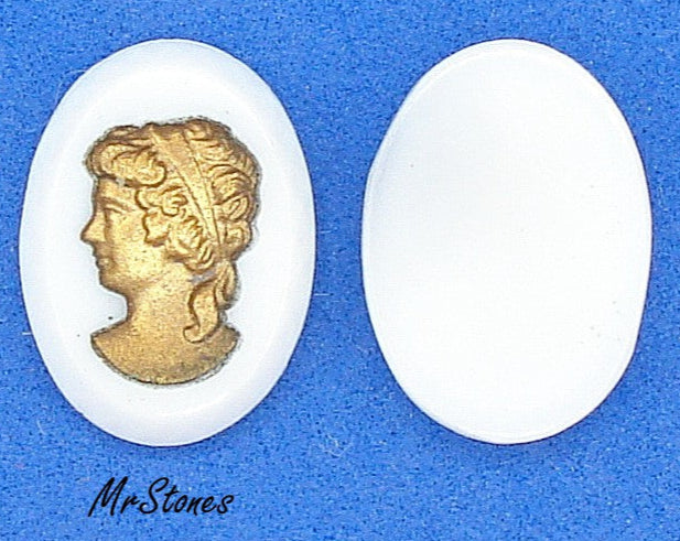 18x13 mm Intaglio Chalk White Oval Left Facing Golden Lady 3.5mm thick Faceted Sides. Vintage Glass Stones.