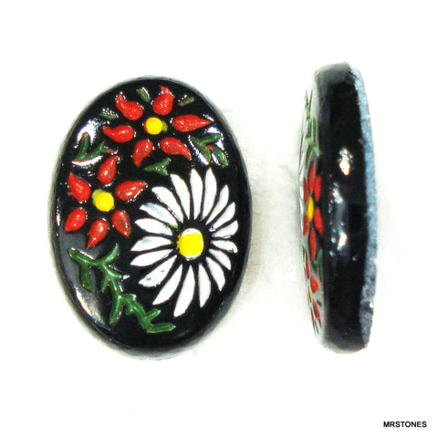 18x13mm (VFP) Glass Black Oval Enamel Red White Floral Flower