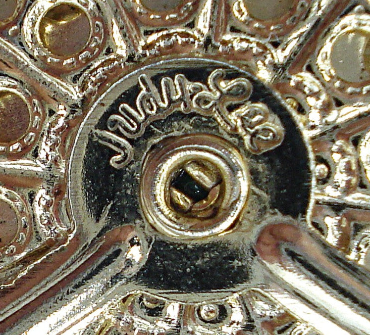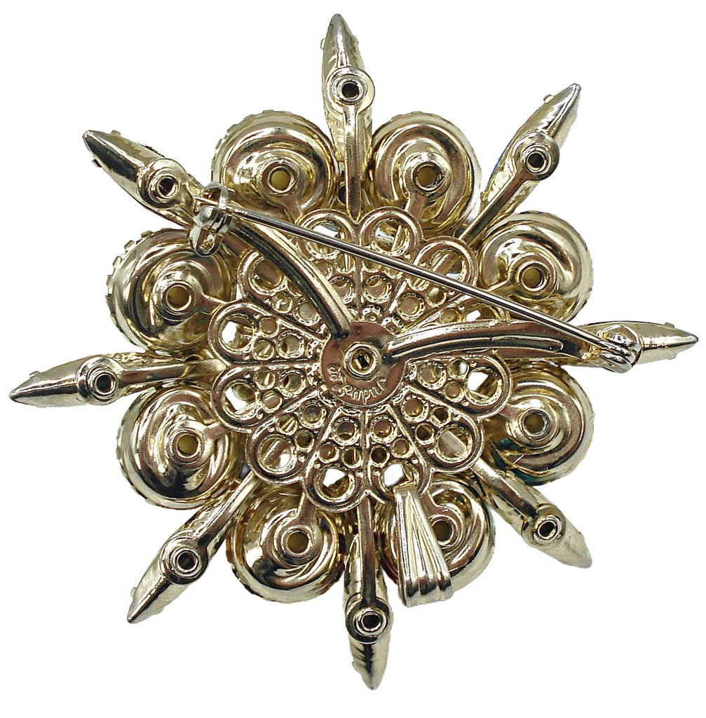 ~Judy Lee Brooch/Pendant 15x4mm Multi Color Marquises and Rounds, Baroque Faux Pearls Large 18mm High Dome Chinese Jade Glass Cabochon Center. Gold Tone Prong Settings. 2.5" Very Nice Vintage Condition. Lovely Holiday Piece!