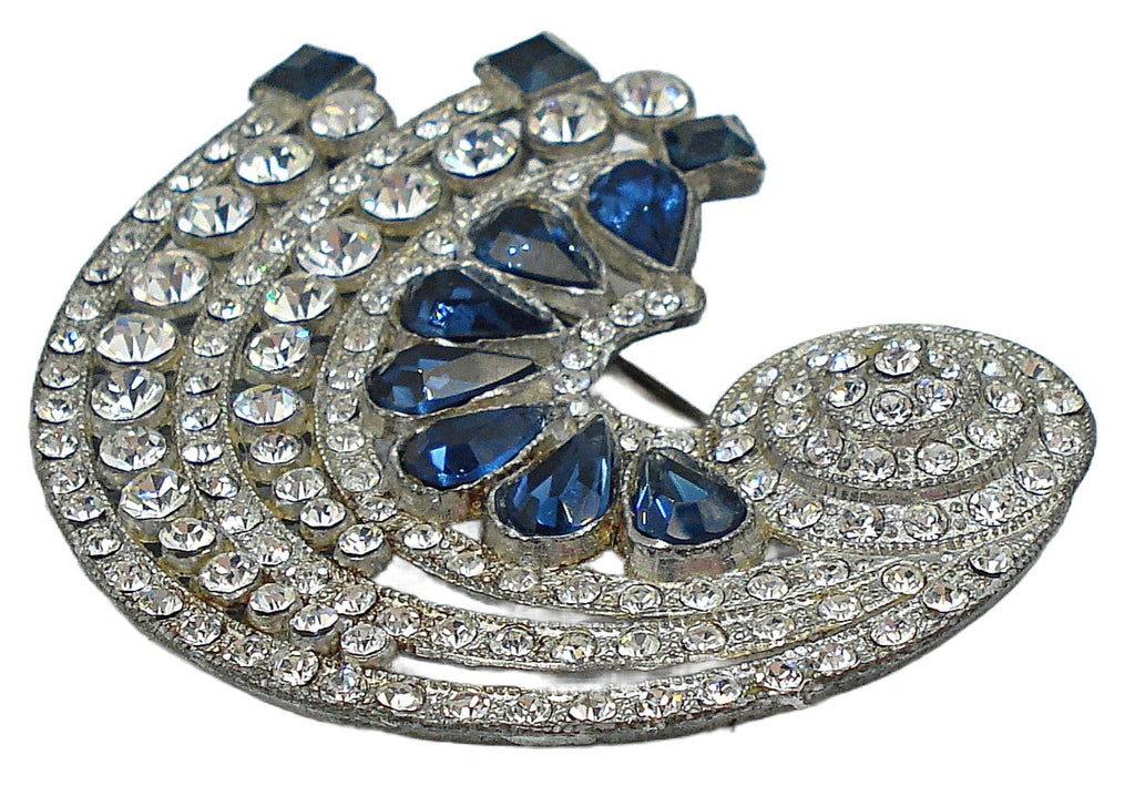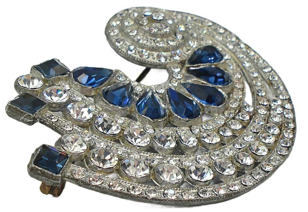 ~Pot Metal 2 1/4" Elegant Design Brooch Crystal Dark Sapphire Mrstones Professionally Re-stoned it. Square, Pear Dark Sapphire Rhinetones. Swirled Rows of Crystal Round Rhinestones. Lots of sparkle!