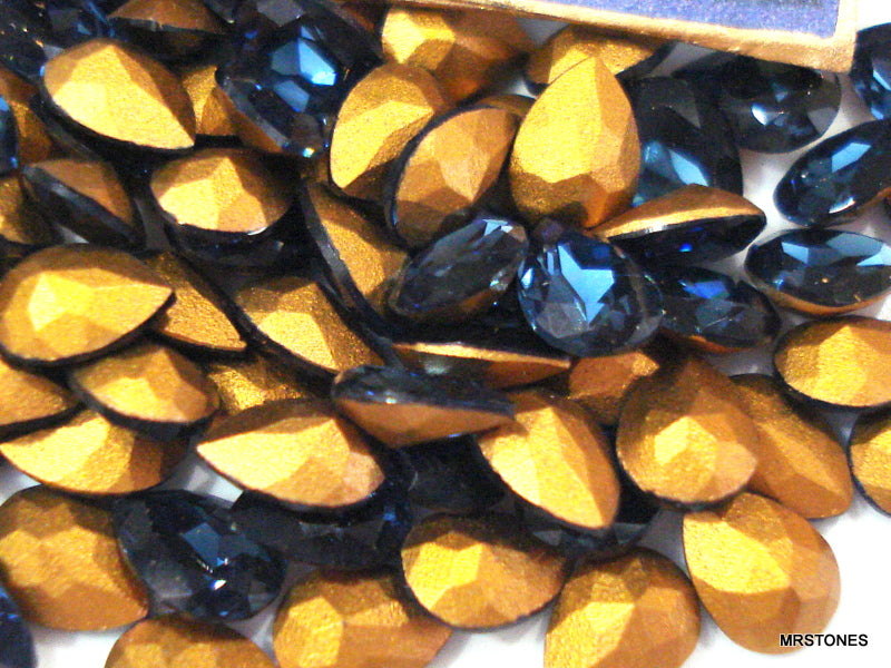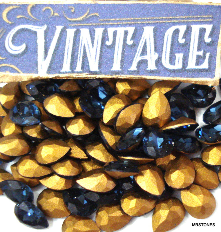 6x4 mm (4320) Montana Sapphire Pears Pendeloques Gold Foiled Pointed Back Vintage Swarovski Rhinestones.