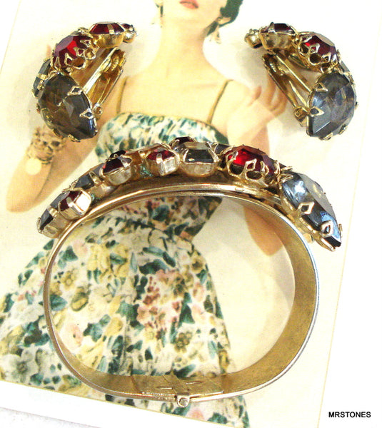 ~Clamper Bracelet Clip Earring Set Black Diamond Siam Topaz Rhinestones. Gold Tone with Complex Prong Settings. Unfoiled Black Diamond and Topaz Cushion Octagon and Pendanloque Rhinestones. Siam Rounds. Bracelet is 6.5" Circumference and 2" at Widest on Top. Clip On Earrings are 1 3/4" Very Good Vintage Condition.