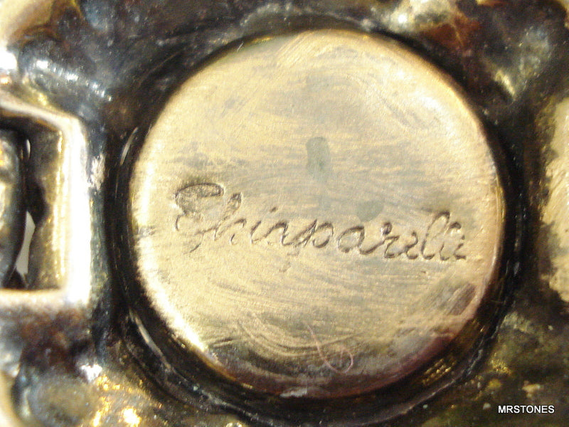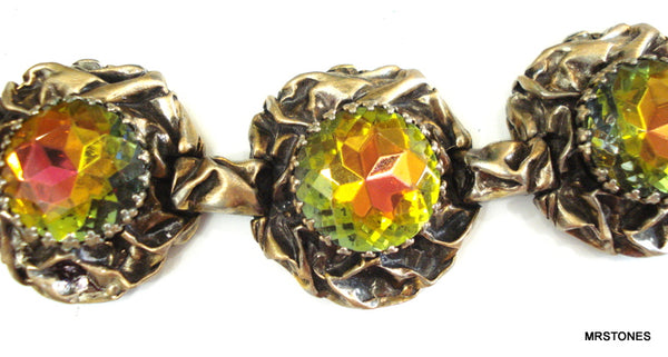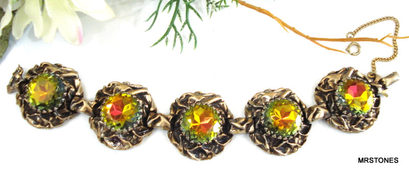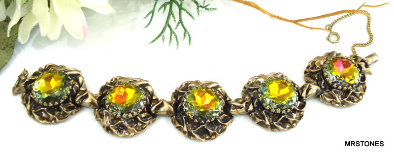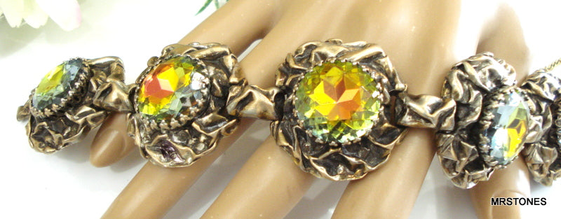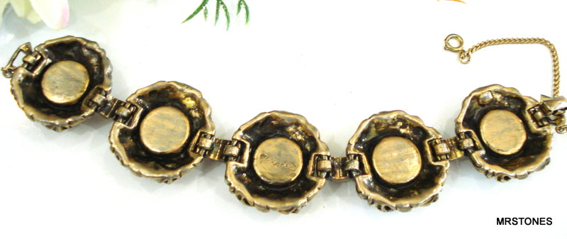 ~VINTAGE SCHIAPARELLI BRACELET ANTQ GOLD TONE LARGE VITRAIL MEDIUM DENTELLES
