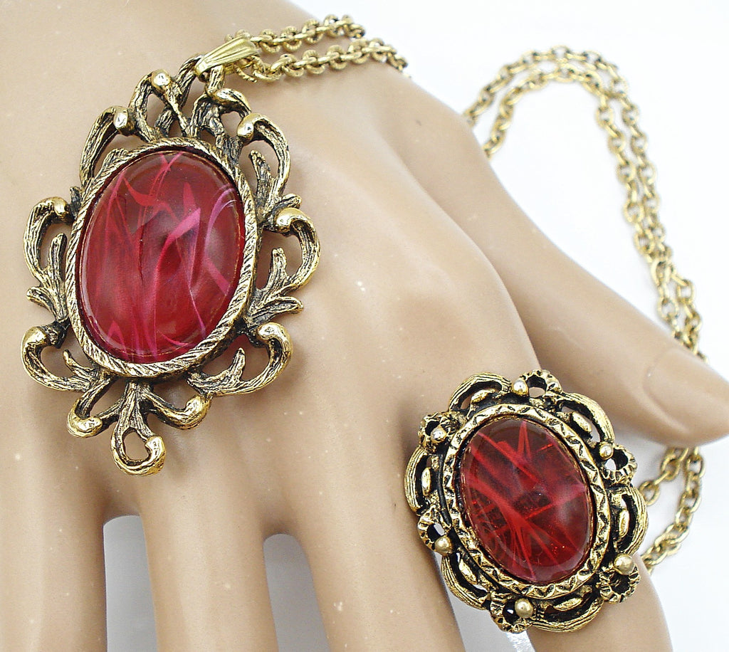 Victorian Revival Set Necklace Pendant Ring Gold Tone Flawed Ruby Glass Cabs