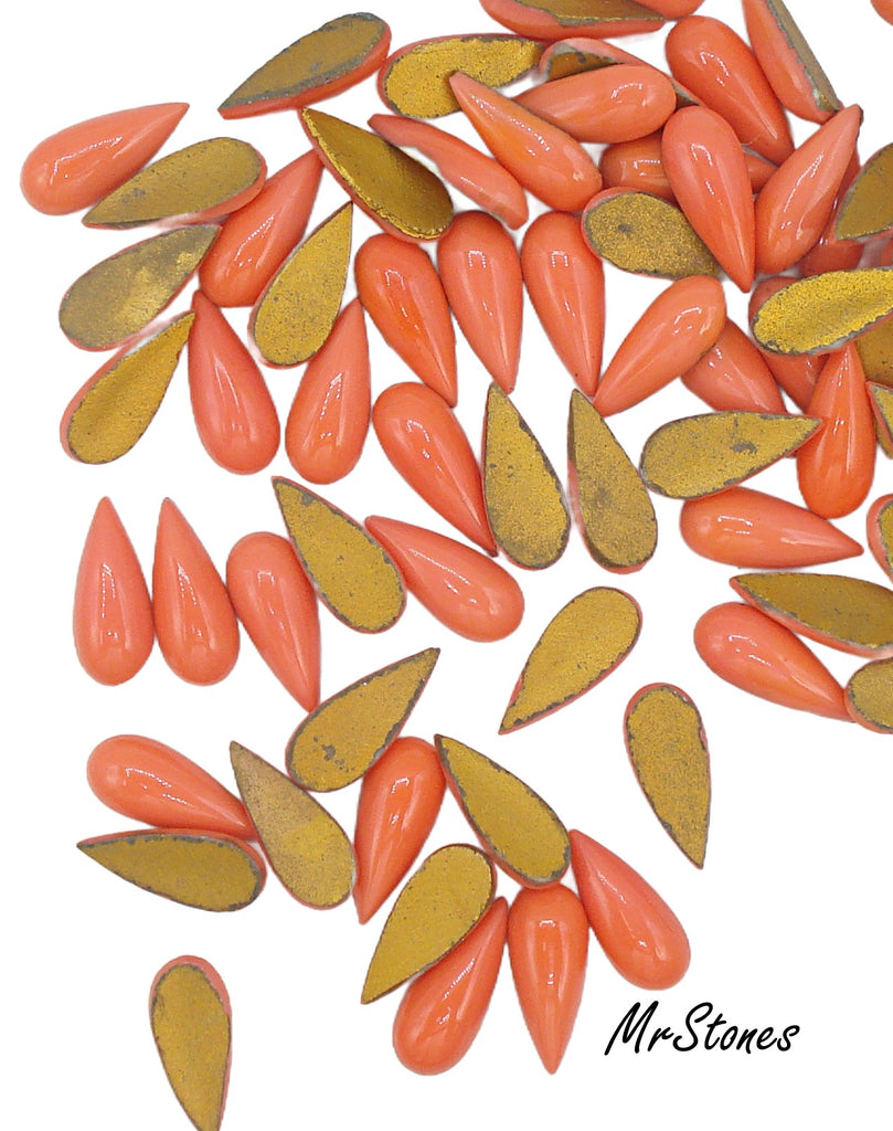 13x6 mm (2390) 12.8 x 5.3 mm Coral Color Glass Pearl Cabochon Gold Foiled Vintage Glass Stones.