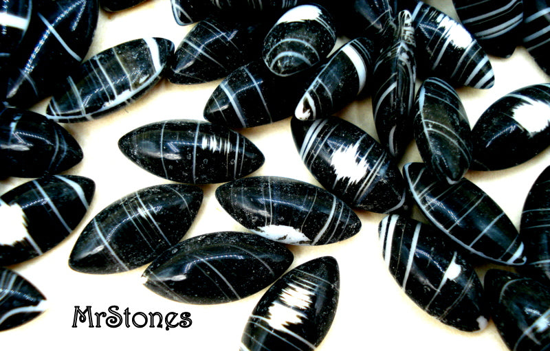 15x7 mm (3175) Black White Stripe Bombe Cut Marquise Navette Vintage Glass West German Stones.  Slightly Curved Bottom (Bombe) Cabochon.