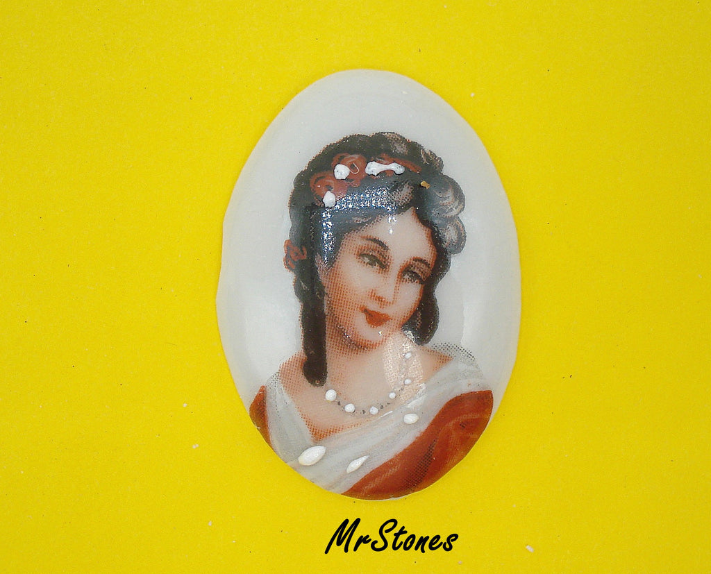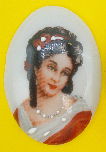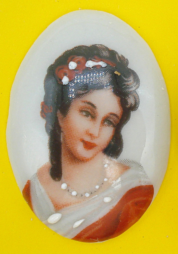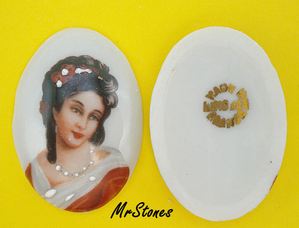 30x22 mm Porcelain Oval Cameo Decal Limoges Textured Pearls. Made in France. Vintage Cabochon of Beautiful Elegant Lady.