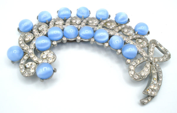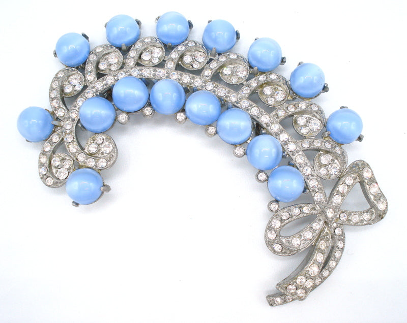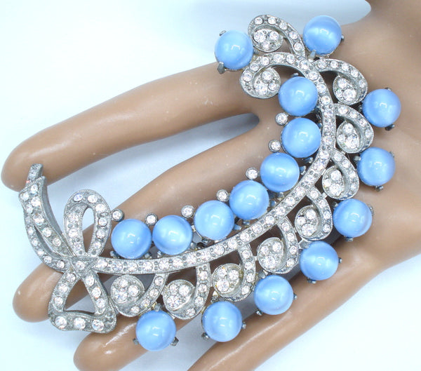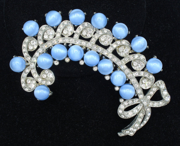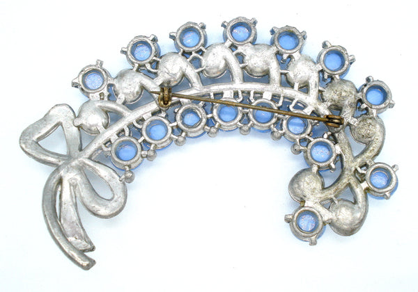 ~VINTAGE 4" BROOCH POT METAL SILVER TONE LEAF FLORAL WITH BOW GLASS BLUE MOONSTONE ROUND CABOCHONS CLEAR CRYSTAL RHINESTONES.  Very nice condition.  Completely re-stoned.