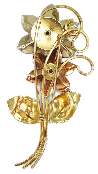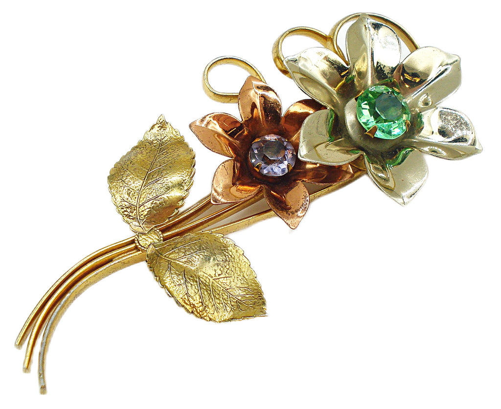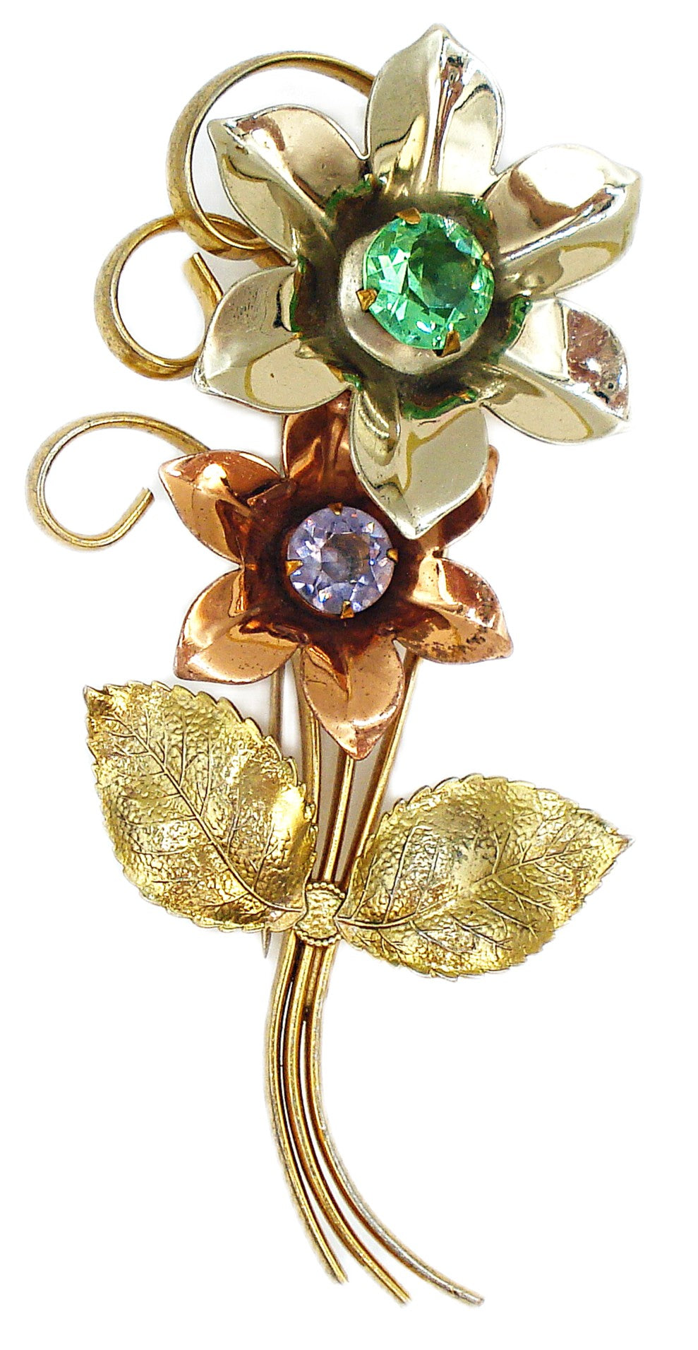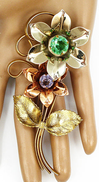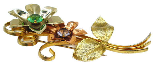 ~4" x 1 3/4" Flowers Floral Brooch 3 Gold Tones Bouquet Peridot Light Amethyst Dentelles Dentelles. Very Pretty Piece.