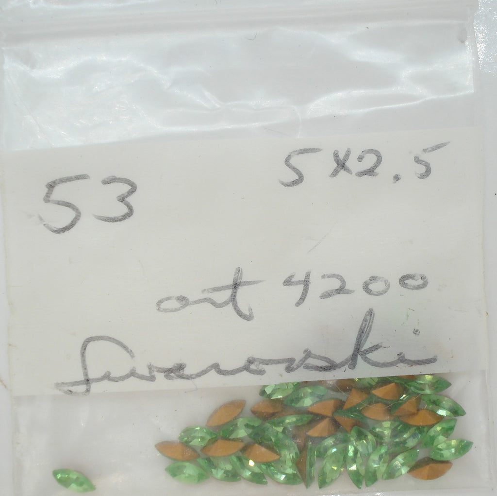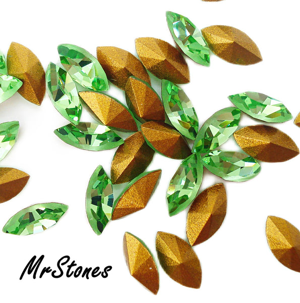 5x2.5 mm (4200) Peridot Green Marquise Navette Swarovski Gold Foiled Vintage Rhinestones.