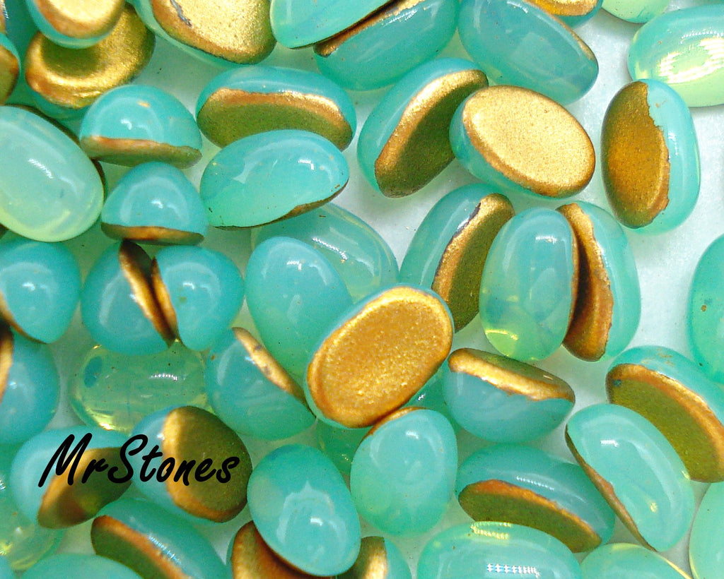 6x4 mm (2195) Mint Seafoam Green Opal Oval Cabochon Czech Glass Stones. Gold Foiled.