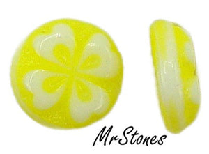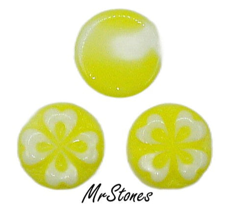 9 mm 9.0 (8.7mm) Round Cabochon Yellow with White 4 Leaf Clover Flower West German Vintage Glass Stones.