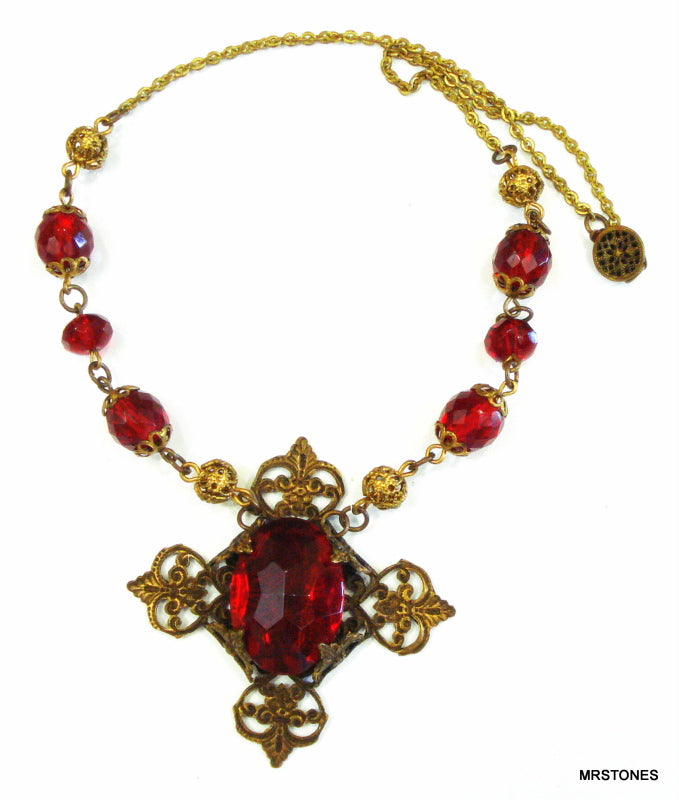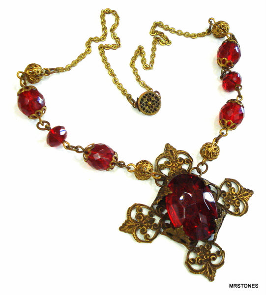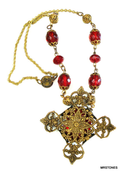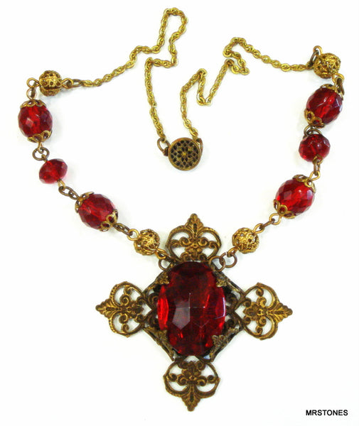 ~VINTAGE ANTIQUE VICTORIAN REVIVAL NECKLACE GLASS RED SIAM RHINESTONE OVAL FULLY FACETED BEADS CROSS FILIGREE GOLD TONE.  16" AND 2" CROSS.