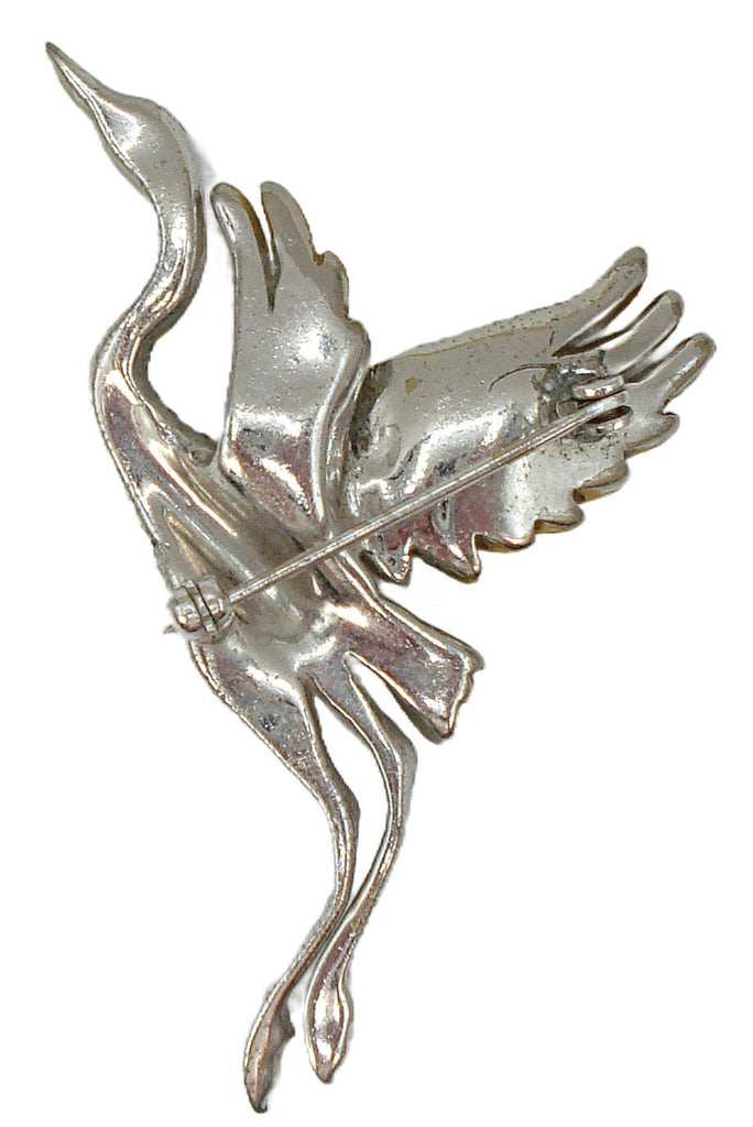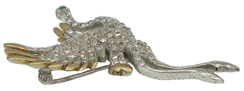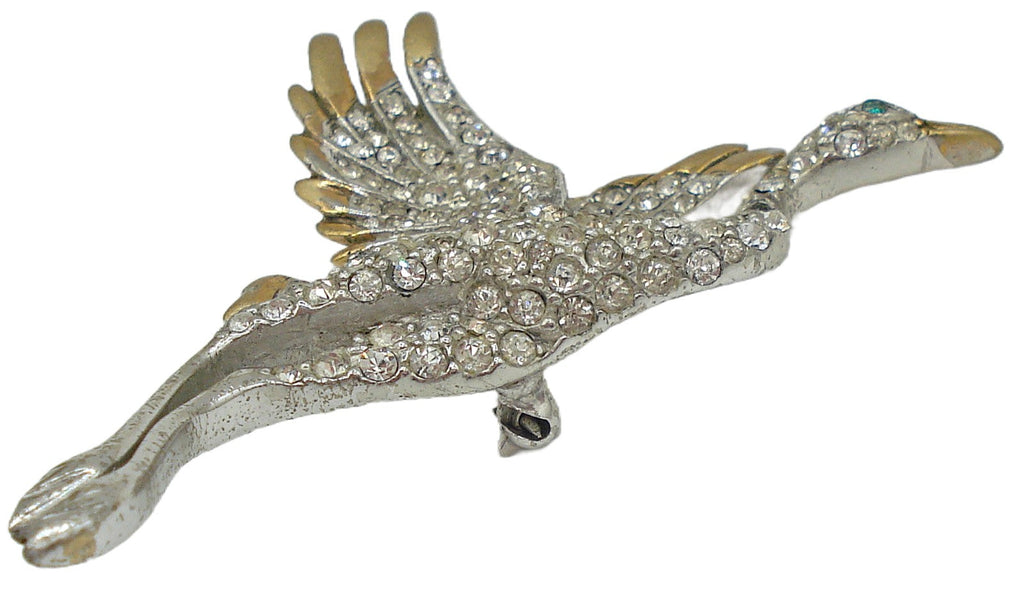~Brooch Bird in Flight Crystal Rhinestones Silver/Gold Tone Emerald Green Rhinestone Eye 2 3/4" Gold Tone Wing Tips and Beak. Nice Vintage Condition.