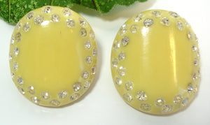 ~Celluloid Clip Earrings Yellow Creme Crystal Rhinestones 1 1/8".  Oval Shape, Nice Condition.