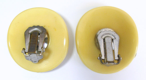 Celluloid Clip Earrings Yellow Creme Crystal Rhinestones 1 1/8"