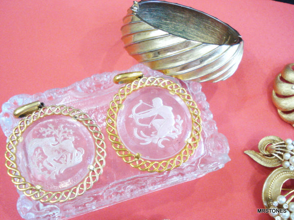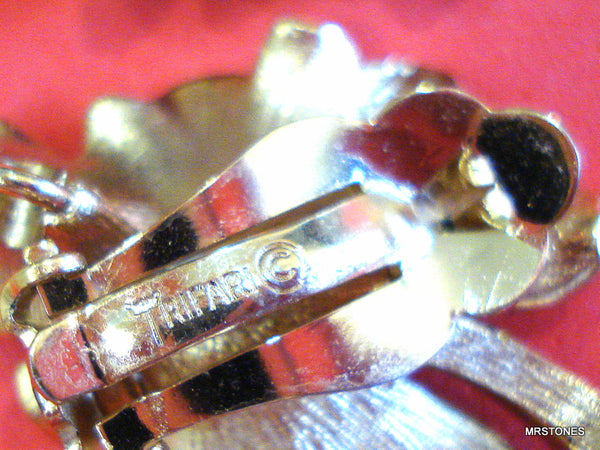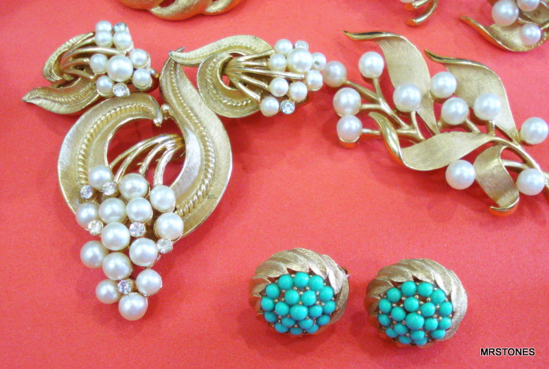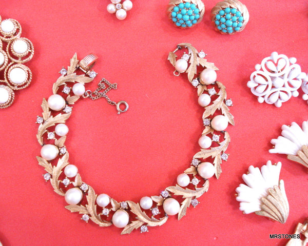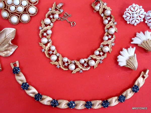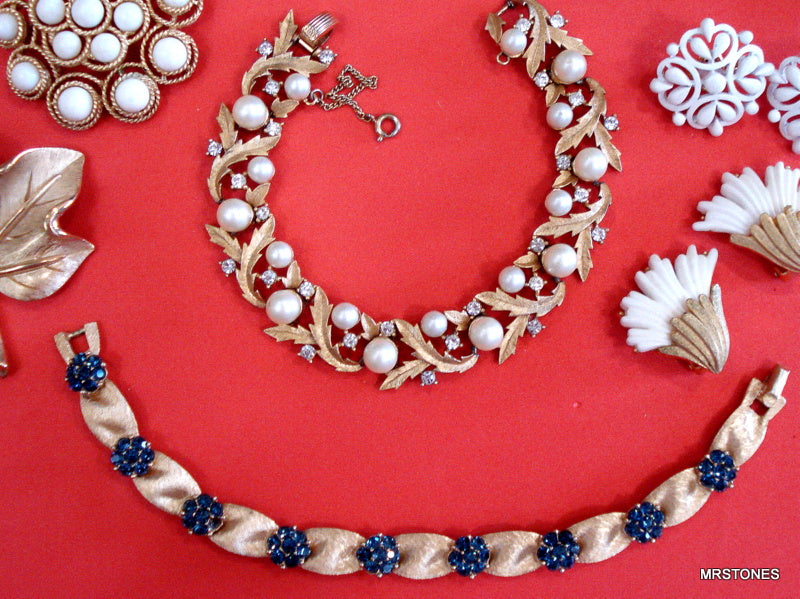 ~Crown Trifari Assorted 14 pc Jewelry Lot.  Gold Tone 3 Bracelets, 4 Clip On Earrings, 3 Brooches, 2 Pendants, 2 Sets.  Rhinestones, Faux Pearls, Faux Turquoise Balls, Etched Glass Aries and Sagittarius Pendants.  White Enamels Earrings, White Lucite Elegant Flower Earrings, Leaf with Rhinestone Bug Earrings, 2 Leafy Sets with Faux Pearls and Crystal Rhinestones in One set.  Chalk White Balls in Rope Swirl Brooch, Leaf and Wreath Brooches.  Hinged Bracelet, Faux Pearl Crystal Rhinestone Bracelet, Montana Sapphire Flower Bracelet.  All very good to excellent condition.