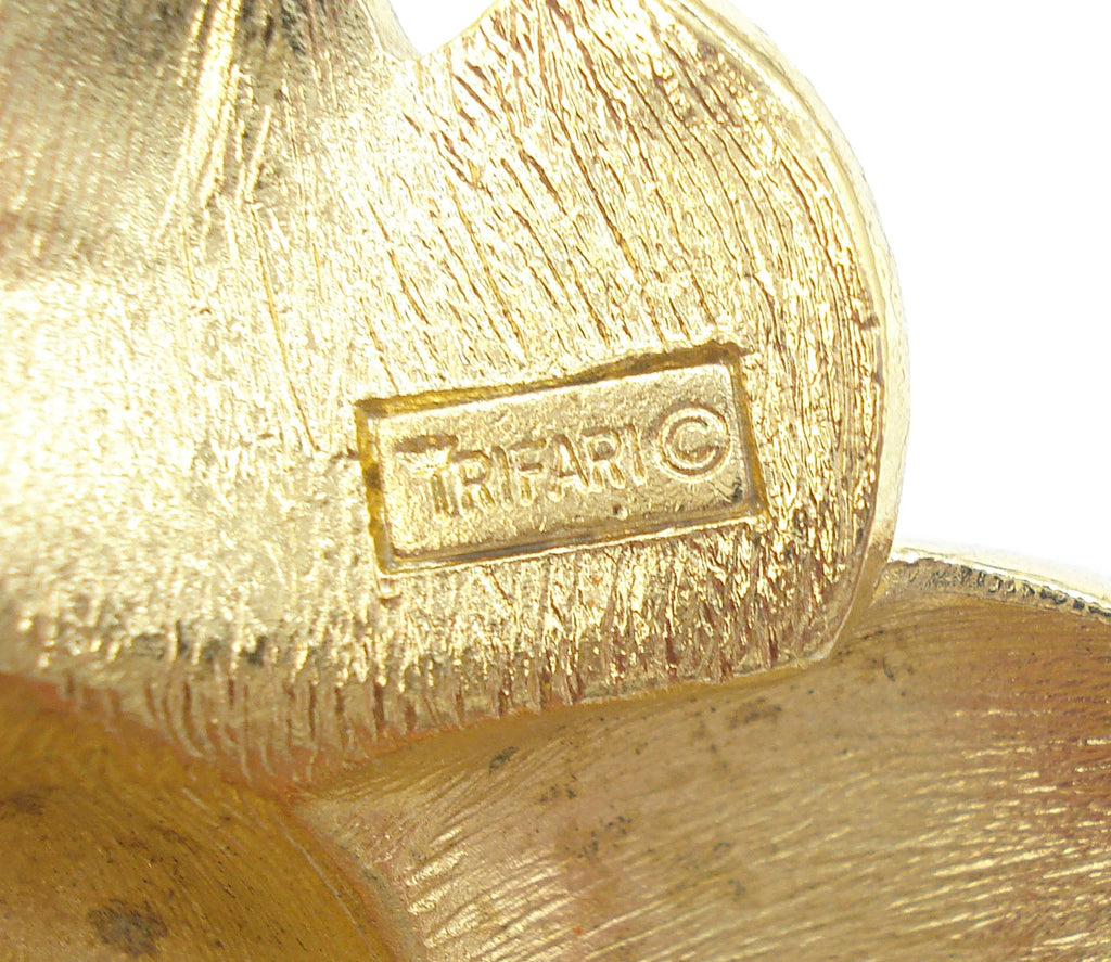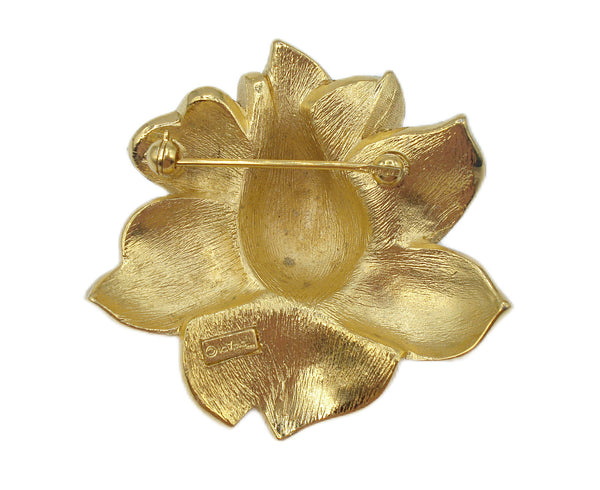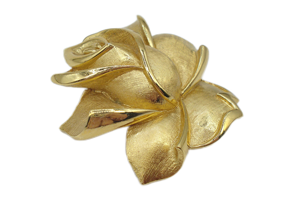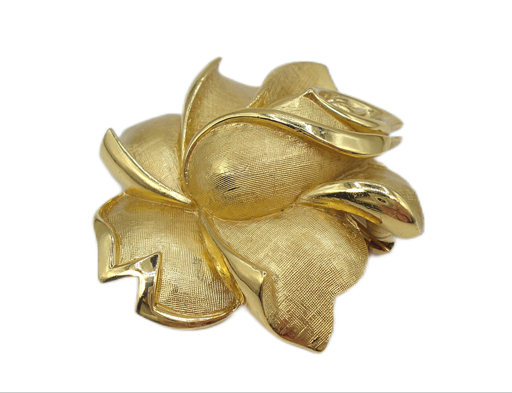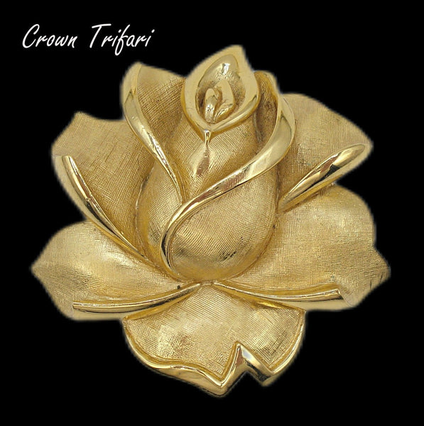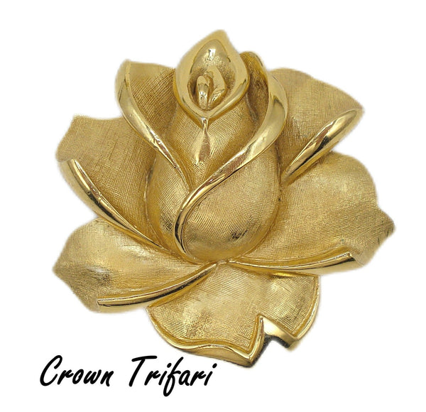 ~Crown Trifari Bold Rose Brooch Dimensional Gold Tone 2" Textured Solid Piece.