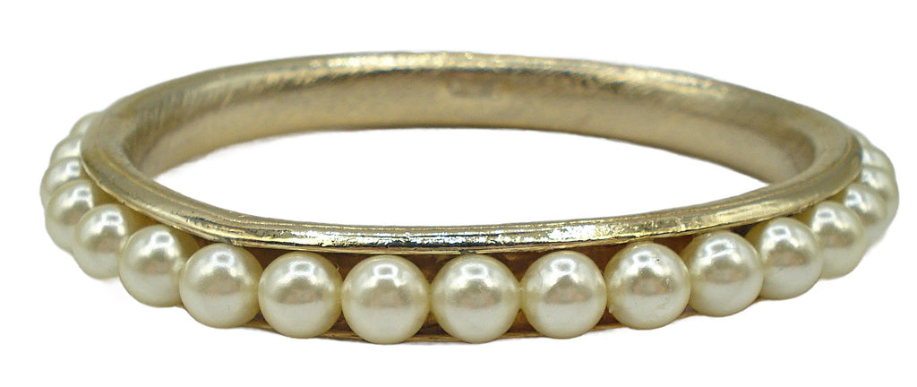 Crown Trifari Oval Shape Bangle Bracelet - 7mm Creme Pearls 7.5" Circumference 3/8" Wide. Completely re-pearled. Rather Weighty.