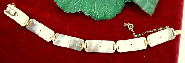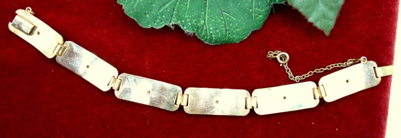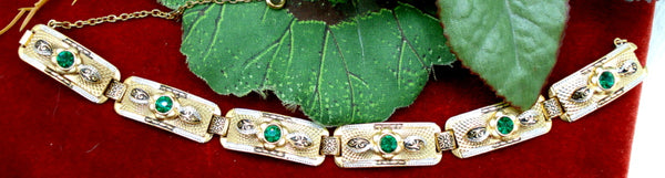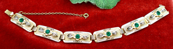 ~VINTAGE BEAUTIFUL DAMASCENE BRACELET UNIQUE EMERALD GREEN RHINESTONES 7" X 1/2"