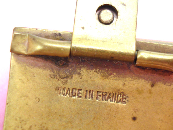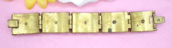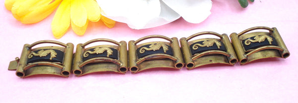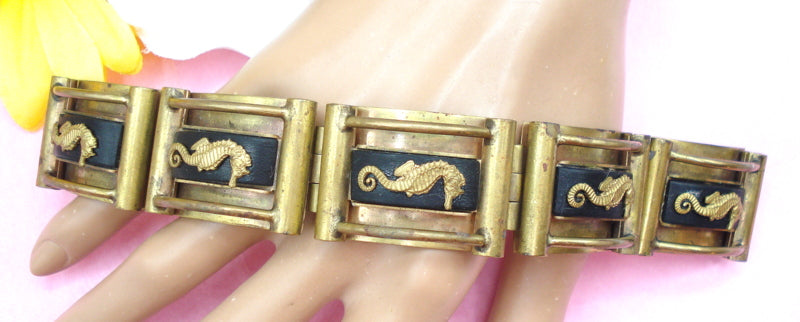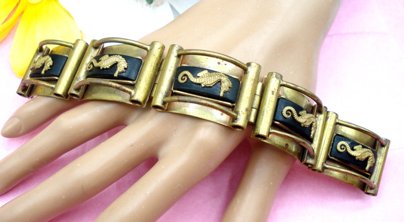 ~VINTAGE DECO 1930s JEAN PAINLEVE BRACELET CHUNKY BRASS SEAHORSES ON BLACK BAKELITE STONES.  7" X 1"  Nice Condition.