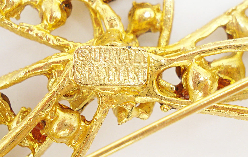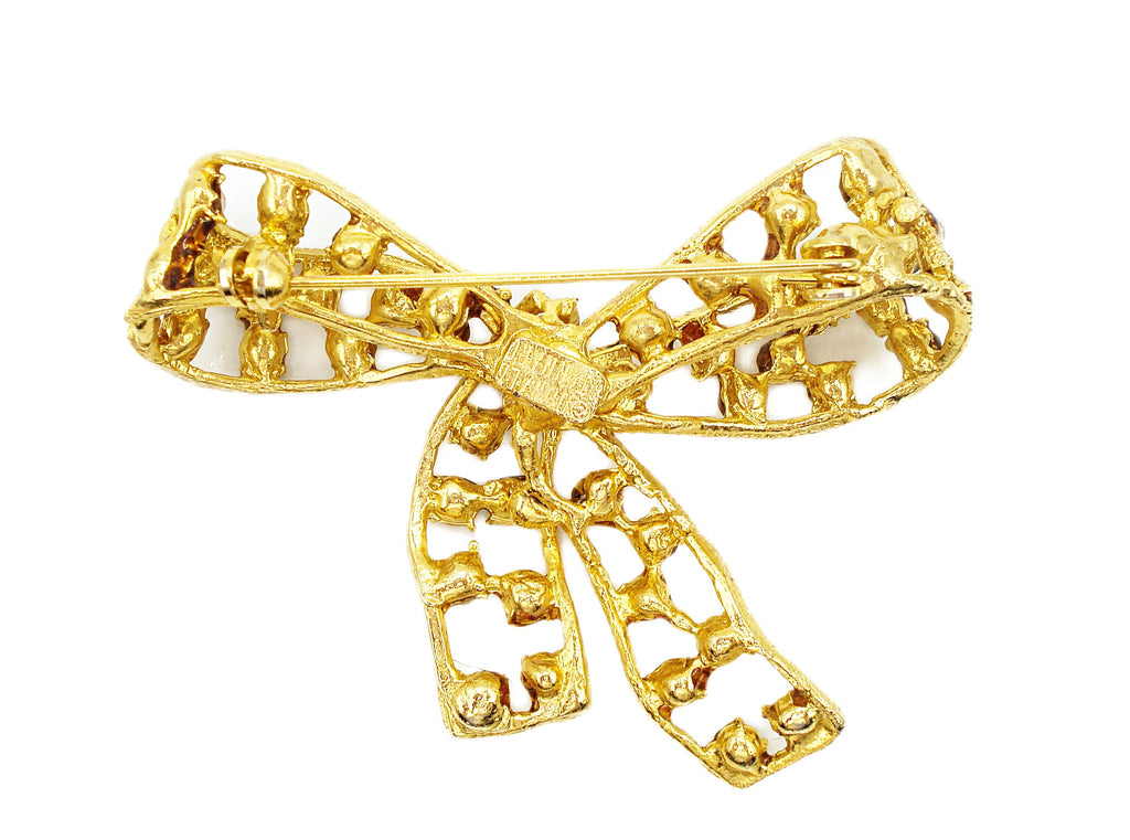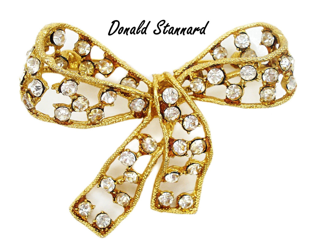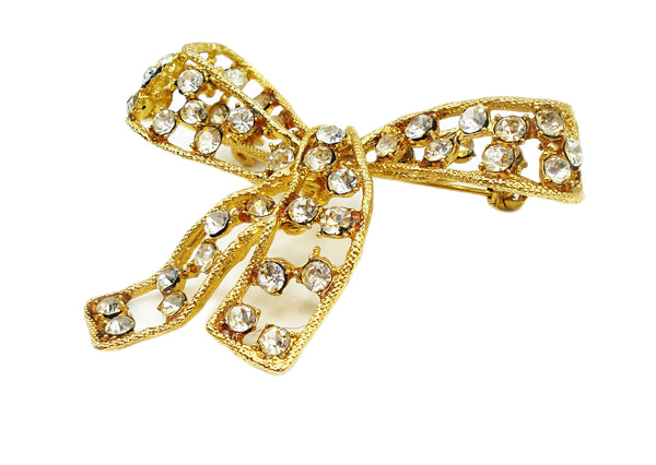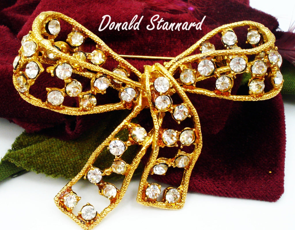 ~Donald Stannard Bow Brooch 2 3/4" Crystal Rhinestones Gold Tone.