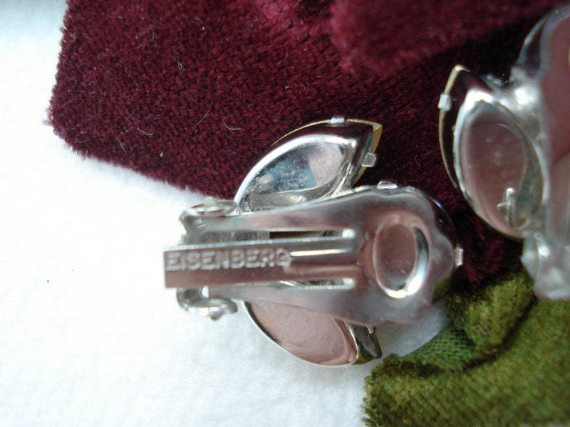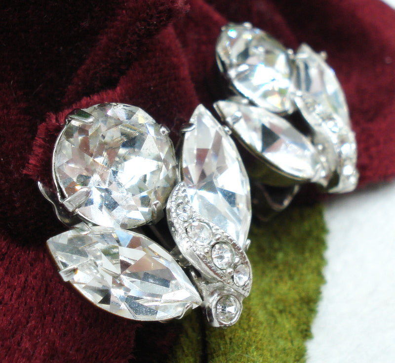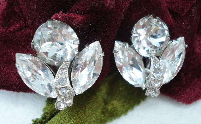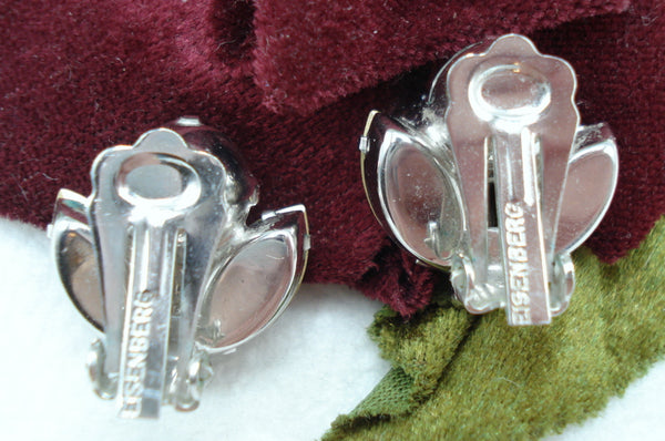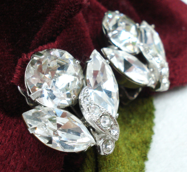 ~VINTAGE SIGNED EISENBERG EARRINGS SILVER TONE CLIP CRYSTAL RHINESTONES MARQ 3/4".