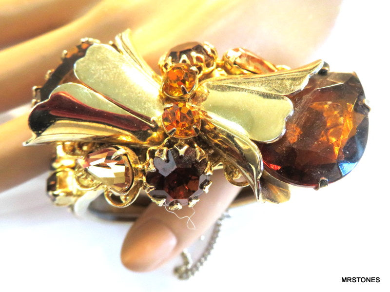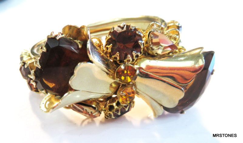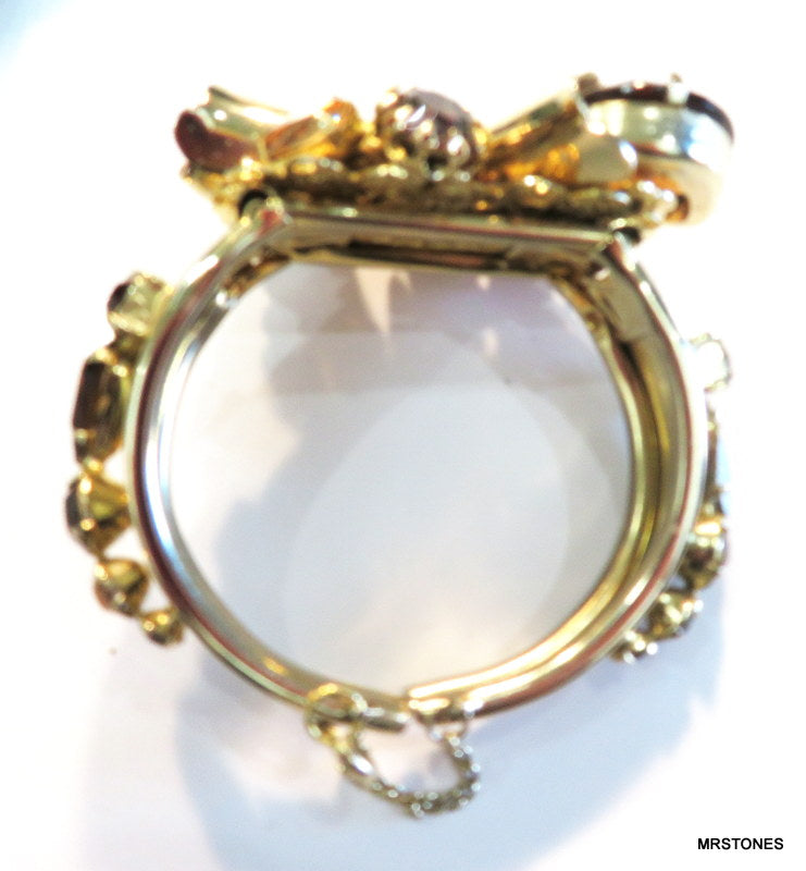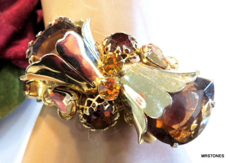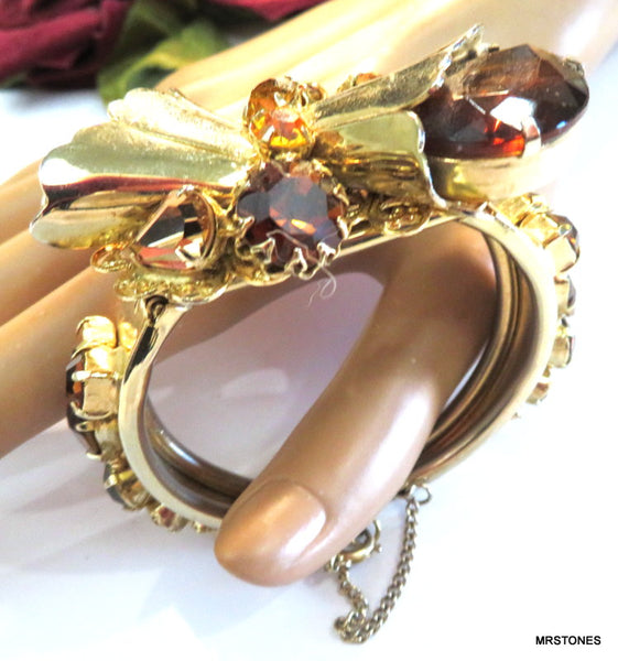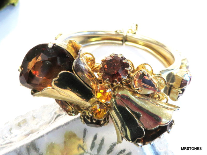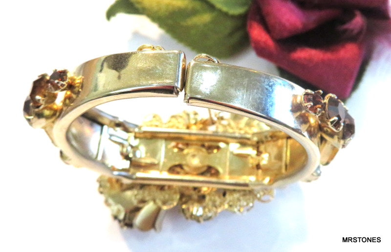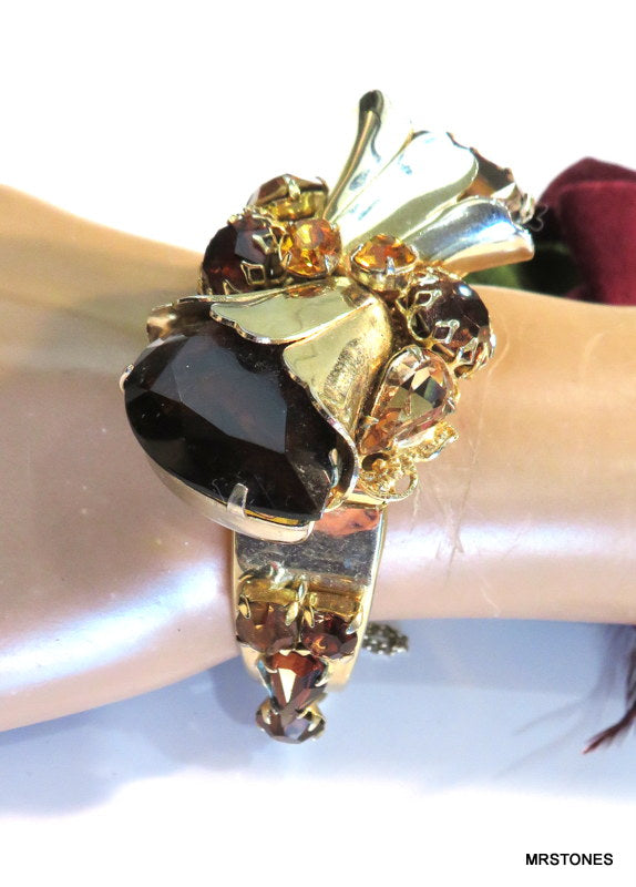 ~VINTAGE STATEMENT DOUBLE HINGED BRACELET GOLD TONE FLOWER ASST TOPAZ RHINESTONES. 6" AND HINGED SIZEABLE. PEAR SHAPE, PENDALOQUE, CUSHION OCTAGON, ROUNDS, ALL PRONG SET. TOPAZ LIGHT SMOKED TOPAZ AND SMOKED TOPAZ RHINESTONES. Safety Chain. Very Nice Condition.