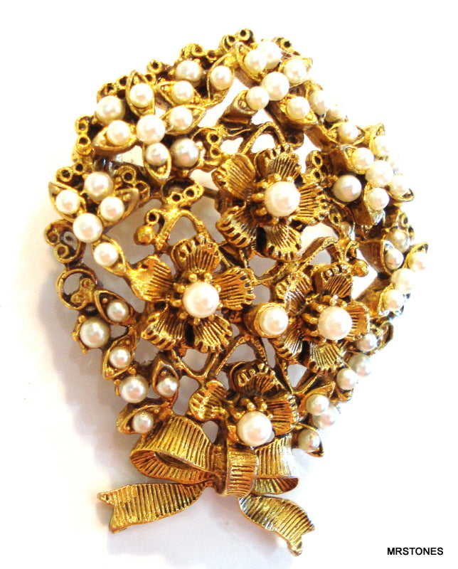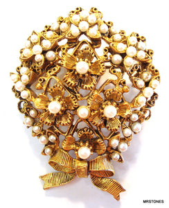 ~VINTAGE SIGNED FLORENZA BROOCH FLORAL WREATH BOW GOLD TONE FAUX PEARLS 2"