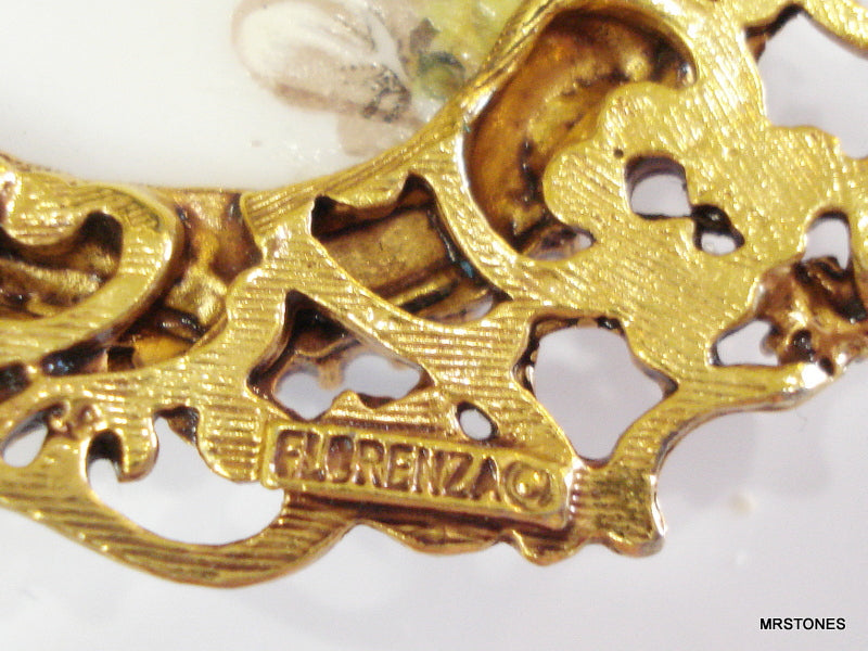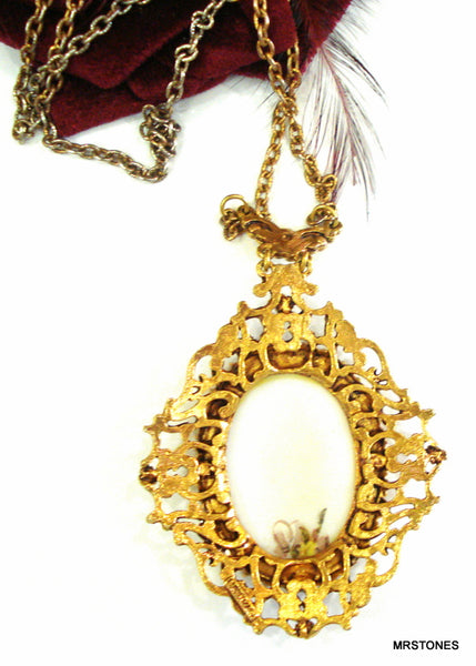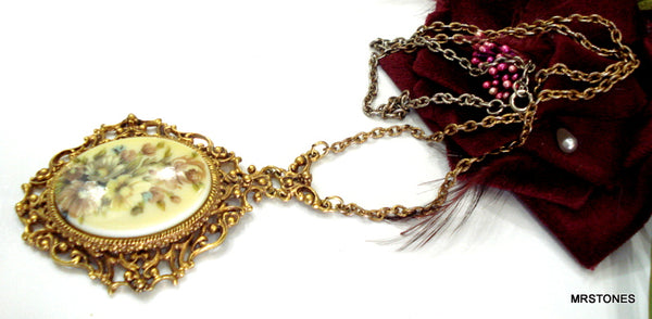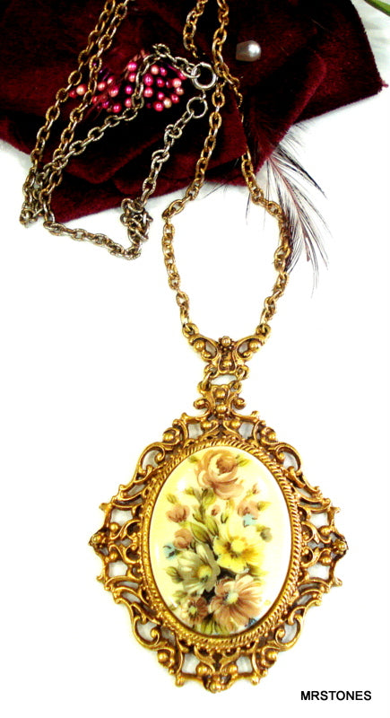 ~VINTAGE SIGNED FLORENZA VICTORIAN REVIVAL NECKLACE PAINTED SOFT YELLOW LAVENDER WHITE FLORAL OVAL CABOCHON.  ORNATE GOLD TONE.  25" CHAIN AND 3" CENTER DROP.  Nice Condition.