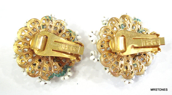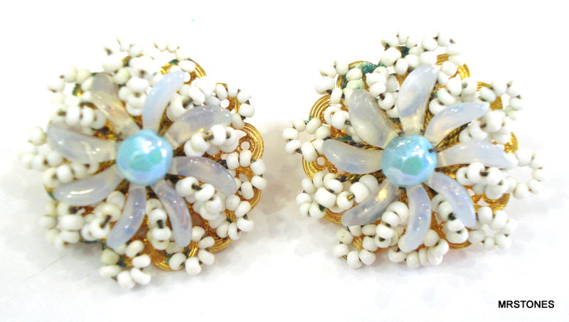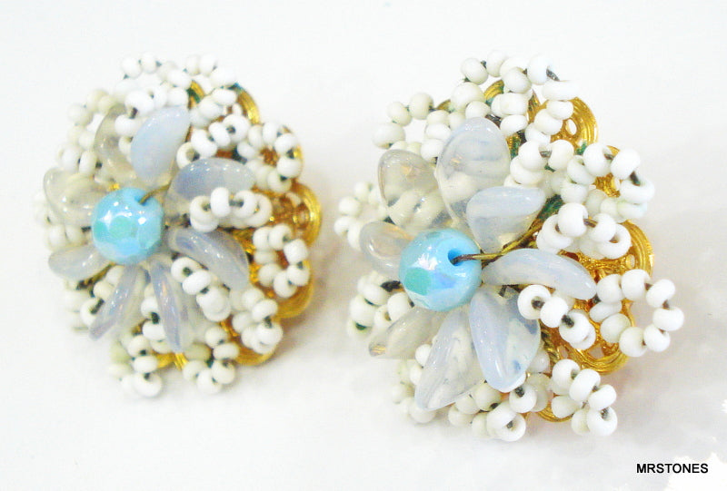~VINTAGE SIGNED HOBE BEADED EARRINGS CLIP GOLD TONE WHITE OPAL WHITE BLUE FLOWERS.  1 1/8"  Very Nice Condition.