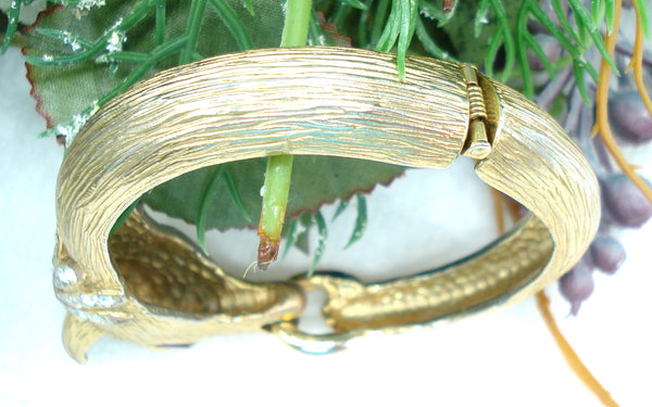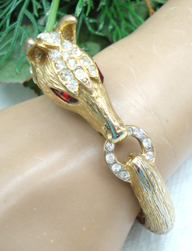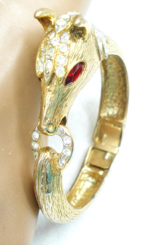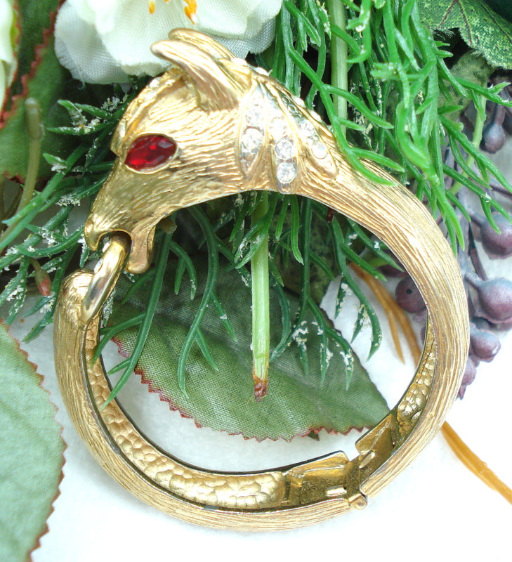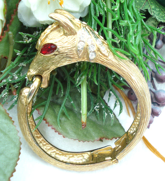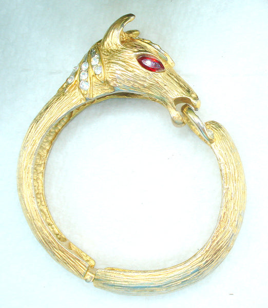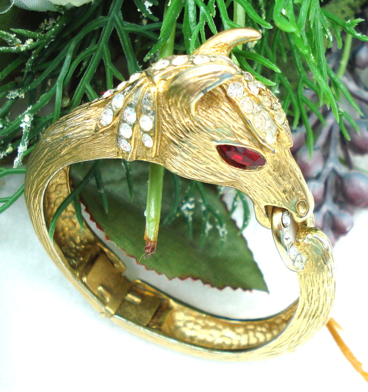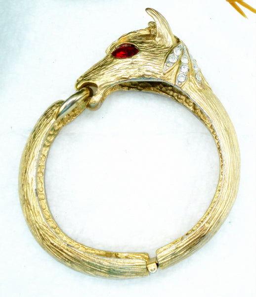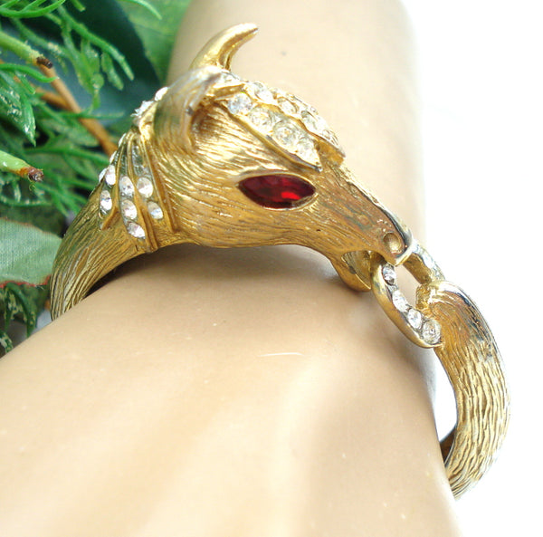 ~VINTAGE HORSE CLAMPER BRACELET GOLD TONE TEXTURED CRYSTAL RED RHINESTONES MANE RING EYES.  6" INSIDE X 1/2".