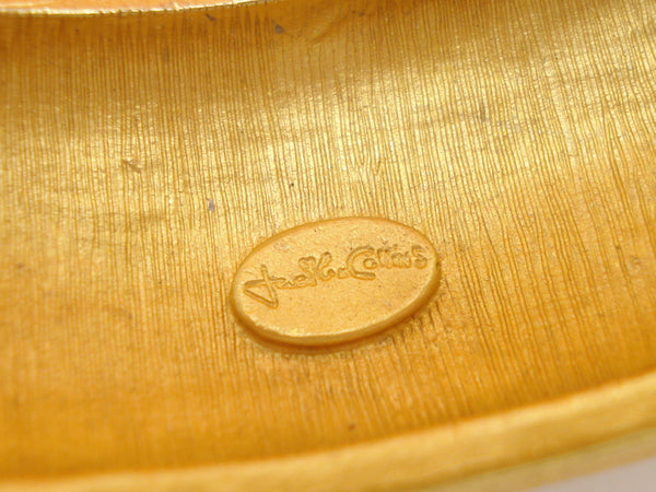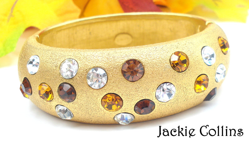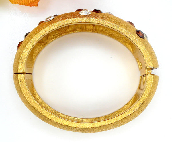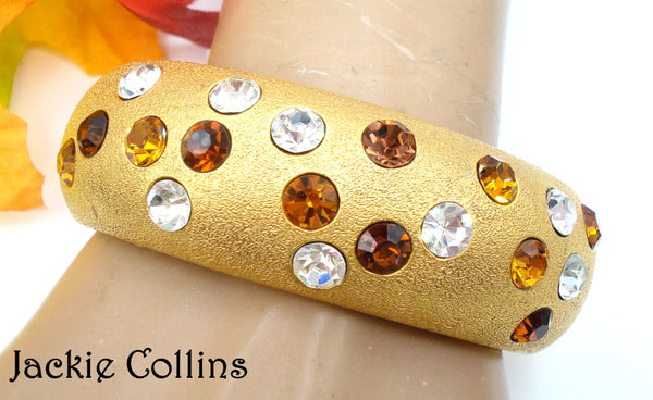 ~JACKIE COLLINS-Clamper Bracelet Textured Gold Tone 2 Color of Topaz and Crystal Round Rhinestones.  Heavy Metal Runway Piece.  6 3/4" Circumference x 1" Width.  Very Nice Condition.  Fall Fashion!