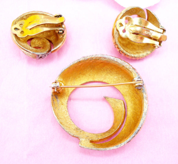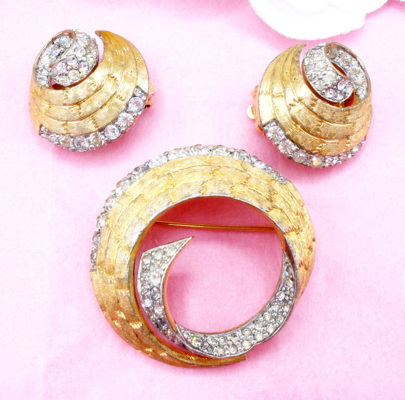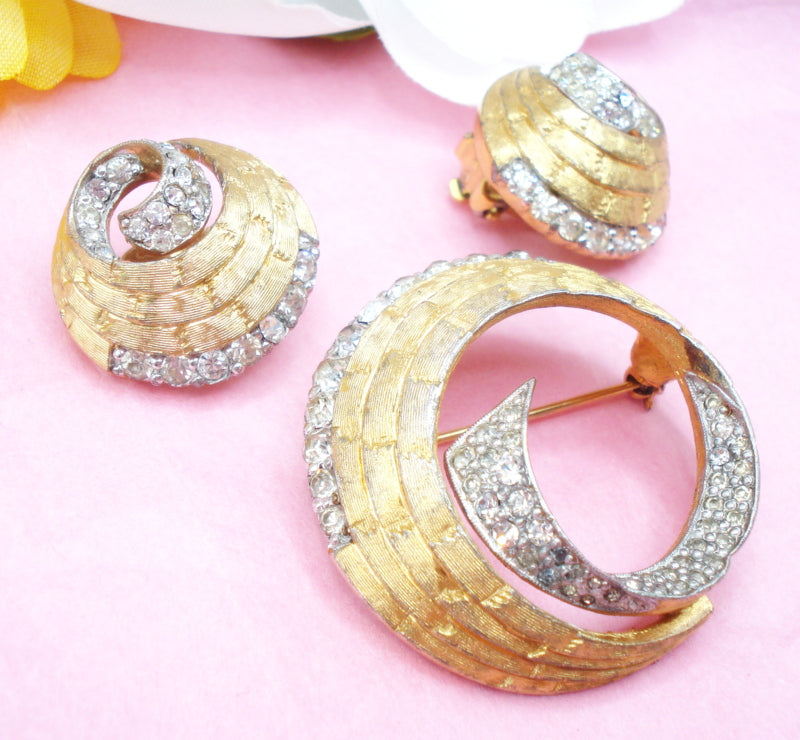 ~VINTAGE JOSEPH MAZER JOMAZ SET - 1.5" BROOCH 1" CLIP ON EARRINGS BRUSHED GOLD TONE BRICK PATTERN SWIRL CLEAR CRYSTAL RHINESTONES.  Nice Condition.