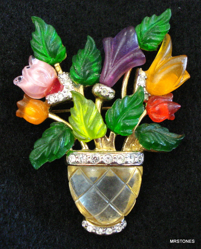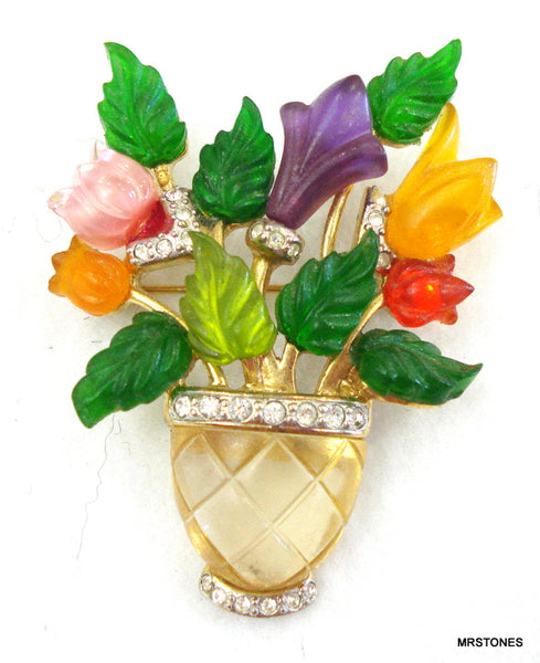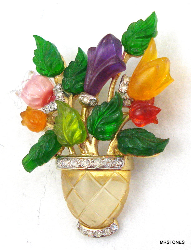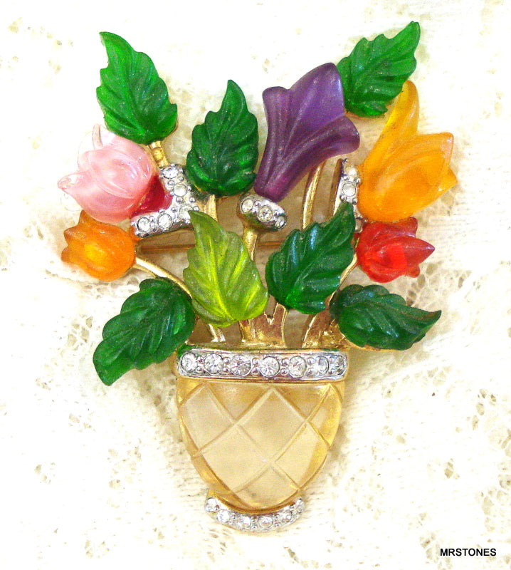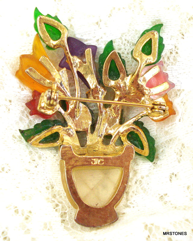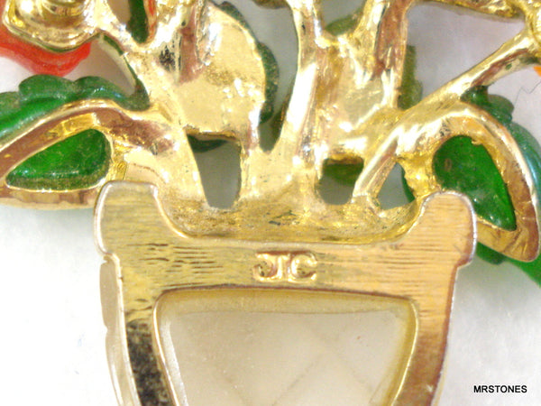 ~VINTAGE JOSEPH CLEARY BROOCH ASST FLORAL FLOWERS BOUQUET VASE CRYSTAL RHINESTONE.  Gold Tone 2" signed JC