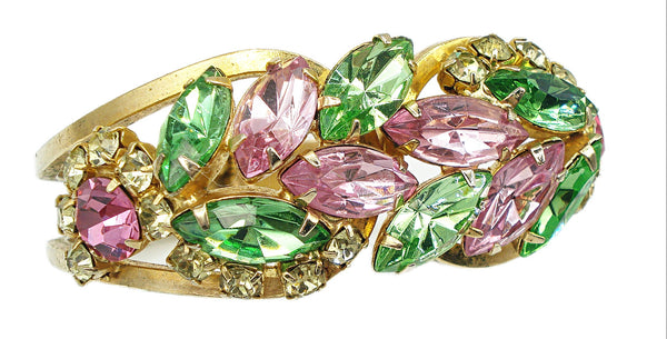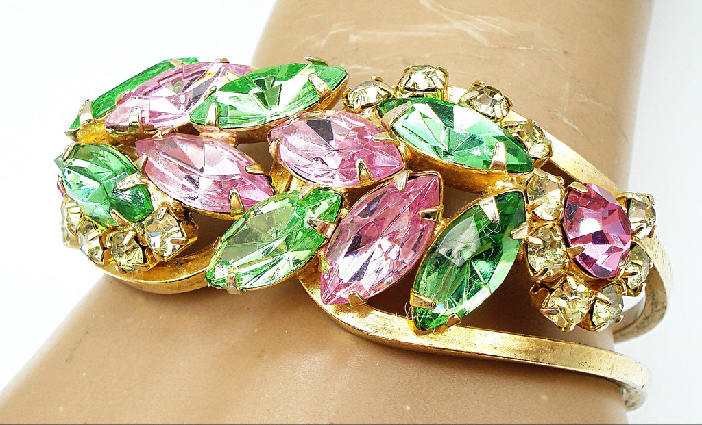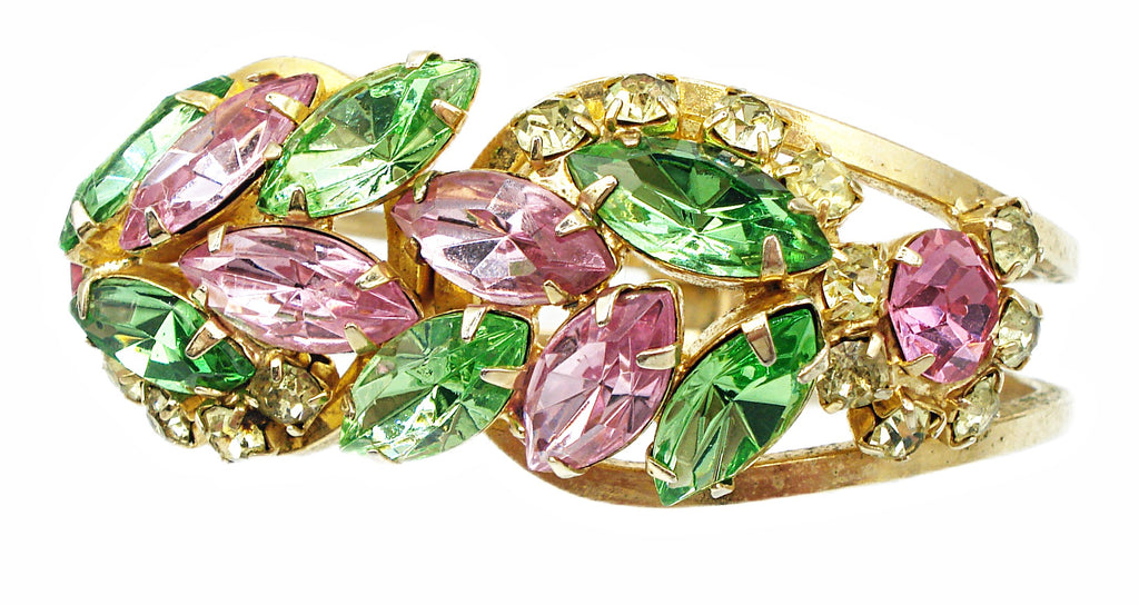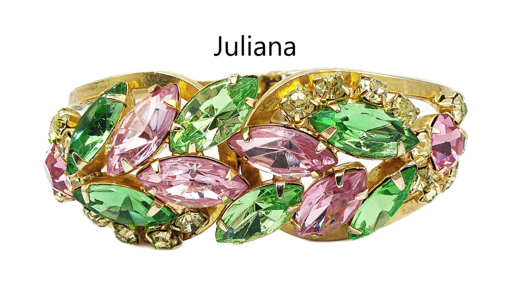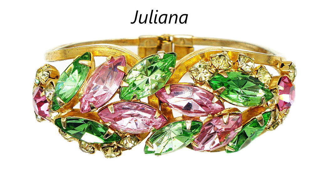 ~Juliana Clamper Bracelet Pastel Rose Peridot Jonquil Prong Set Gold Tone. *All large old stones replaced with vintage new, same style and cuts etc. So very pretty for Spring! Great Condition.