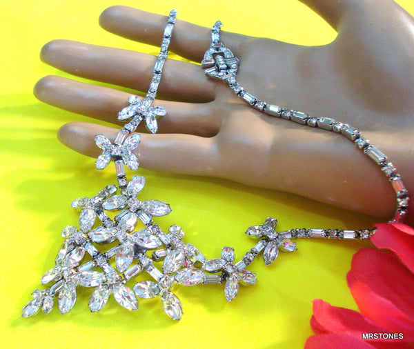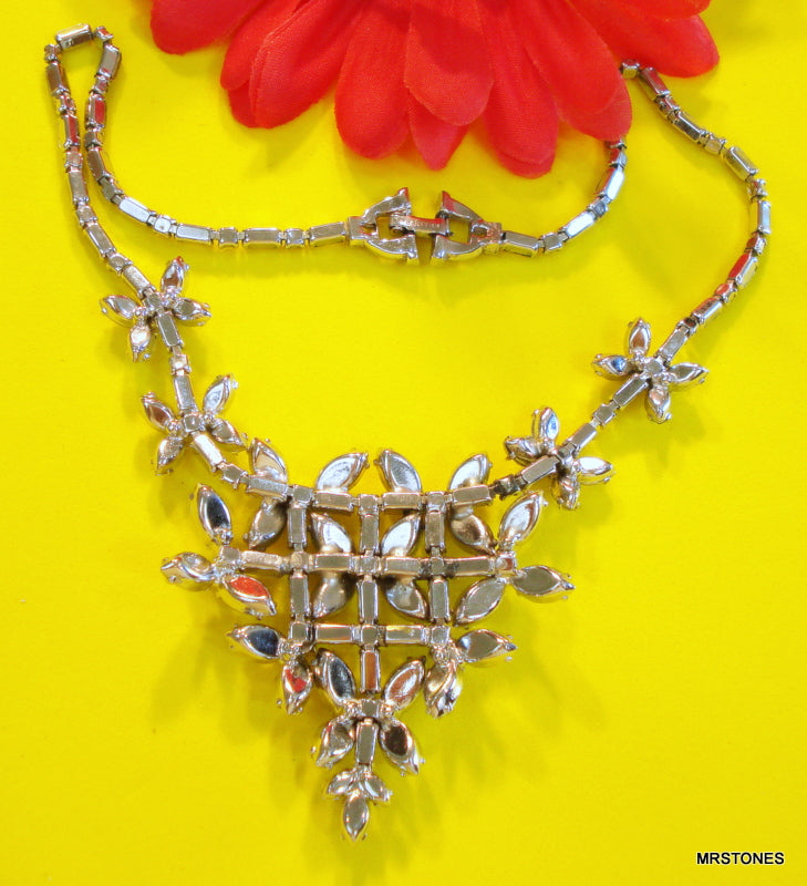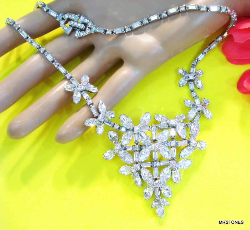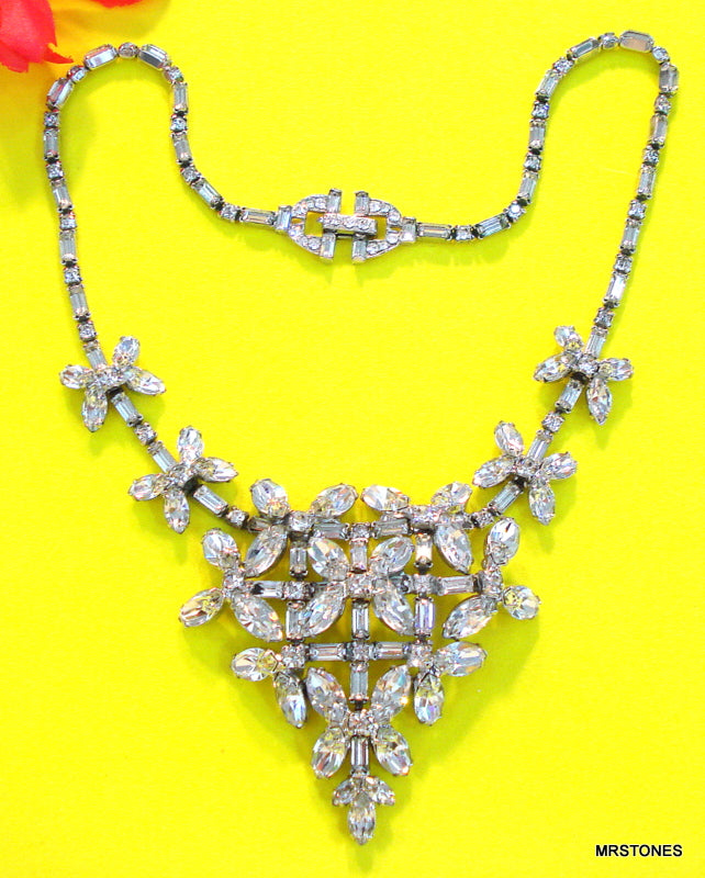 ~VINTAGE SIGNED KRAMER NECKLACE BIB RHODIUM CRYSTAL RHINESTONES - DIMENSIONAL MARQUISE BAGUETTES ROUNDS...PRONG SET ASSORTED SIZES.  15.5" WITH 2.25" CENTER DROP.   LOVELY AND ELEGANT.