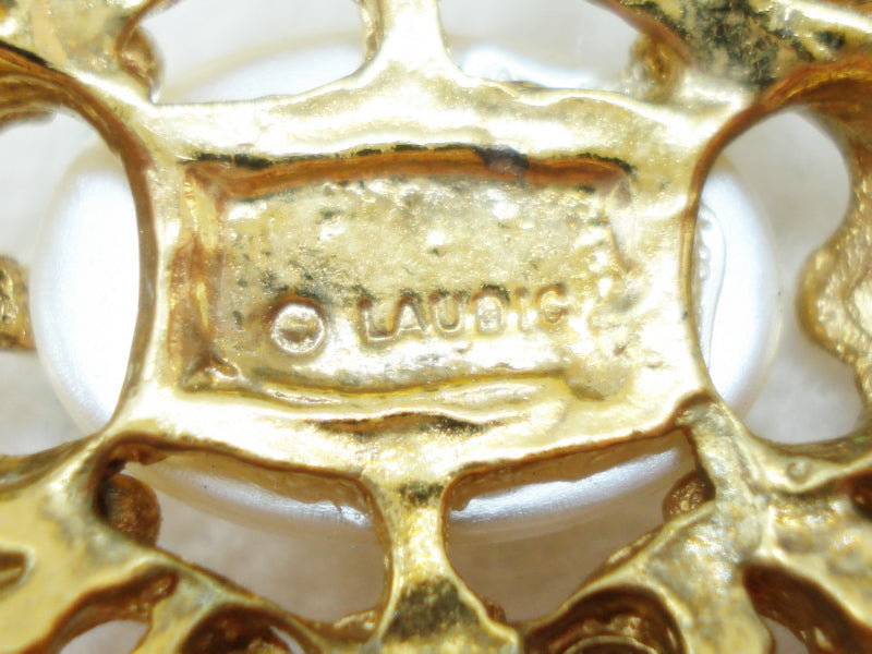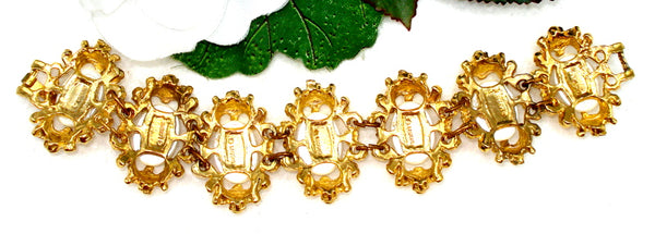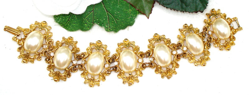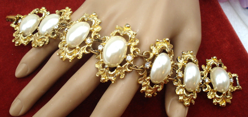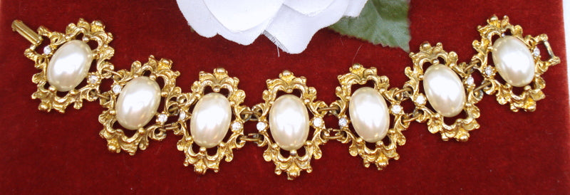 ~VINTAGE SIGNED LAUDIC VICTORIAN REVIVAL BRACELET GOLD TONE FAUX PEARLS CRYSTAL RHINESTONES 7.5" X 1 3/8".