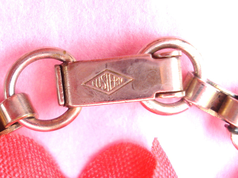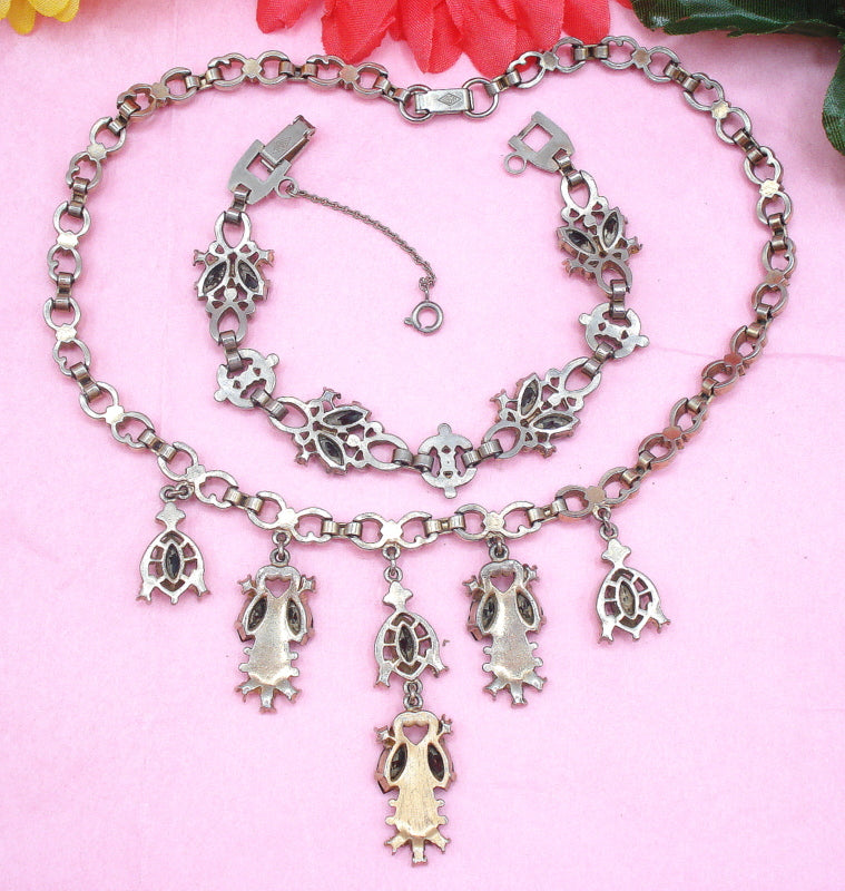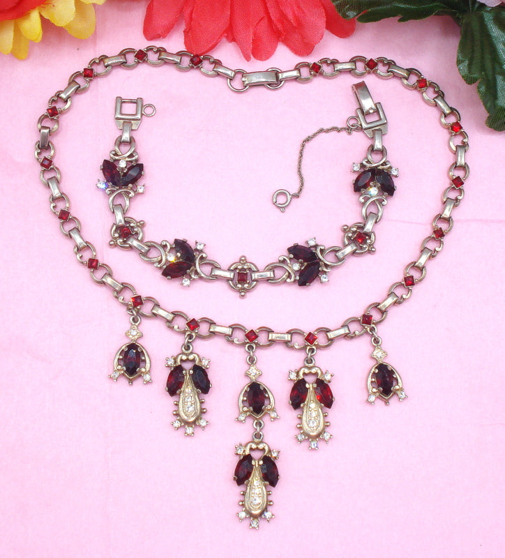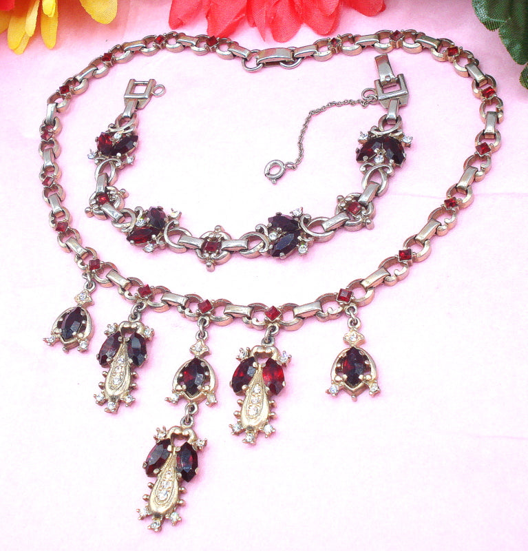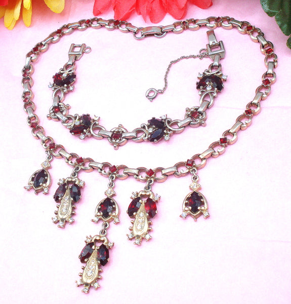 ~VINTAGE LUSTERN SET - 14.5" x 2.5" (dangle) NECKLACE - 7" x 5/8" BRACELET - ASST SIAM RED SQUARES AND MARQUISES WITH ROUND CRYSTAL RHINESTONE ACCENTS GRADUATED DANGLES. Light Gold tone Wash/wear.