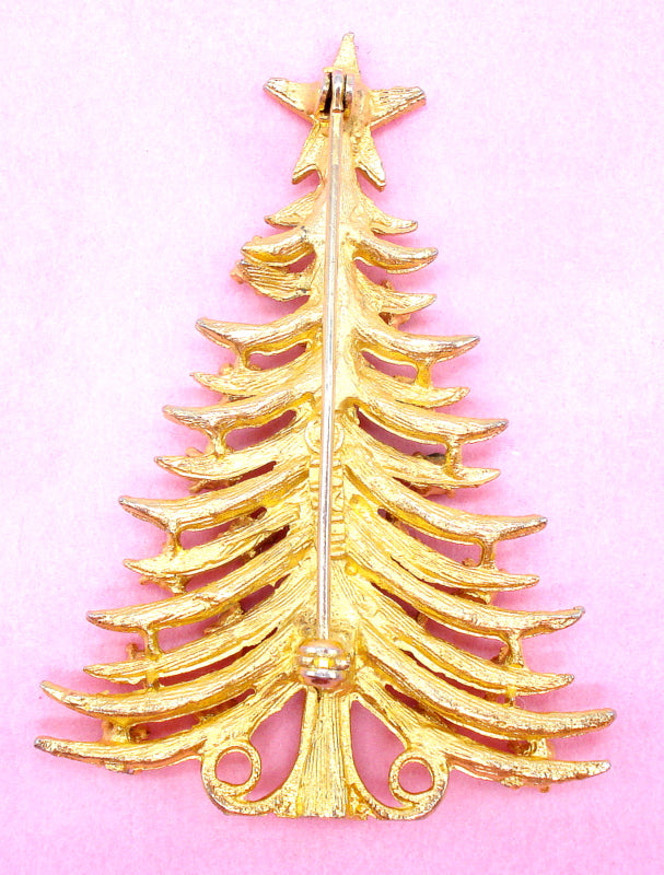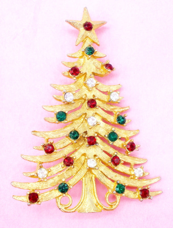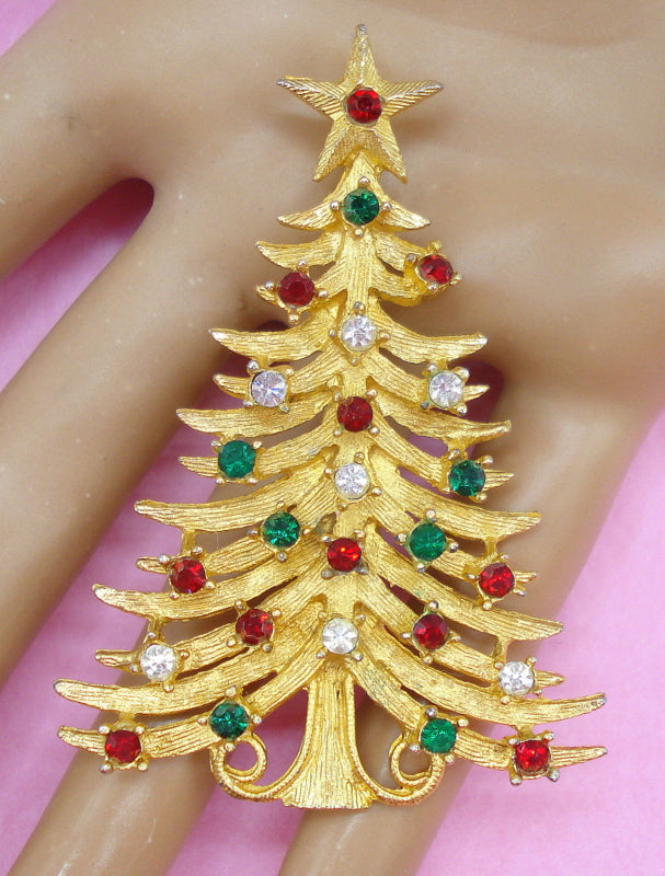 ~VINTAGE MYLU CHRISTMAS TREE BROOCH GOLD TONE RED GREEN WHITE CRYSTAL RHINESTONES 2.5"