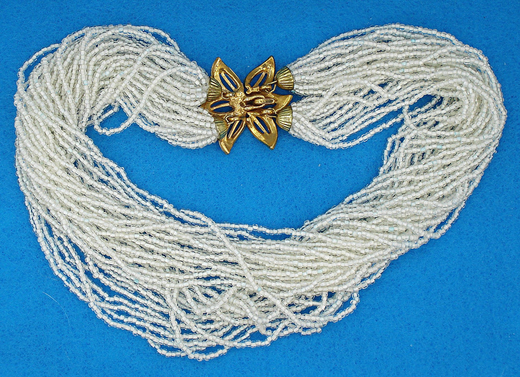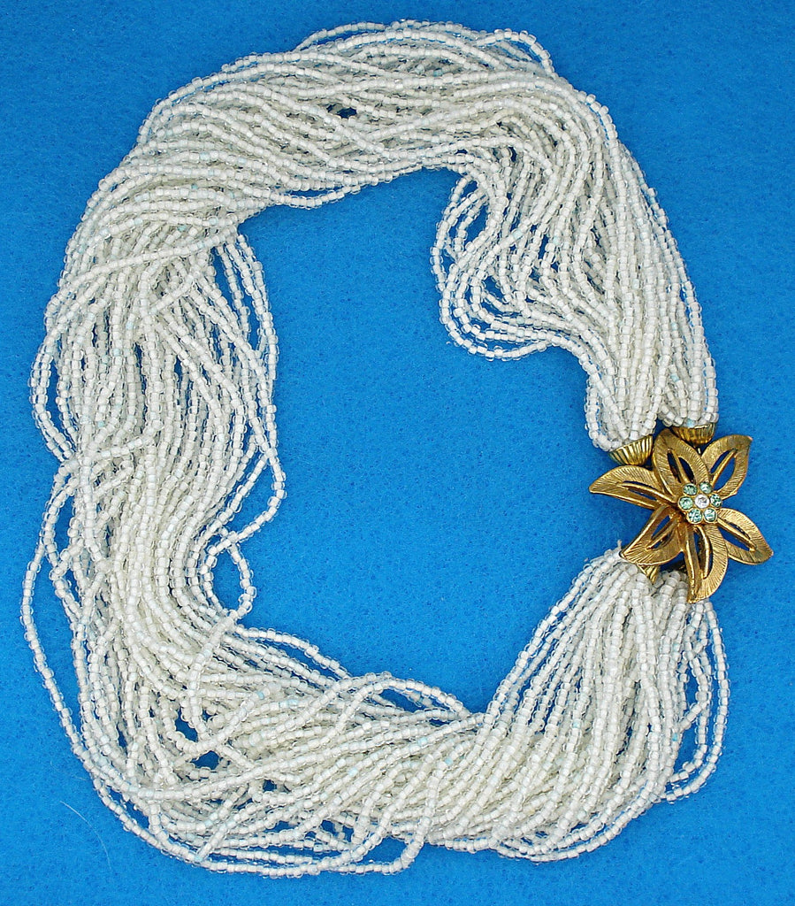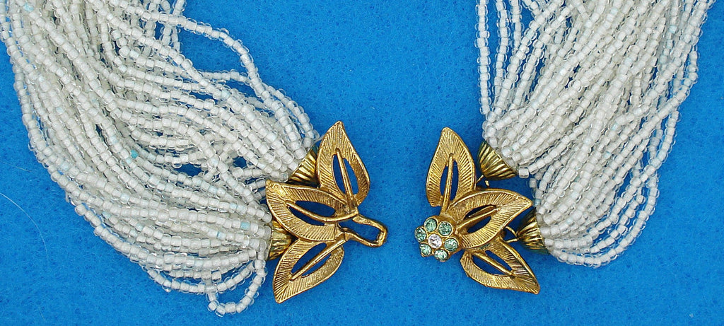 ~16" Multi Strand White Glass Seed Beads Sprinkled Turquoise Accents Beads. Gold Tone Textured Leaves Flower Aqua Rhinestones Hook Clasp. Really Nice Condition. Rather Weighty.