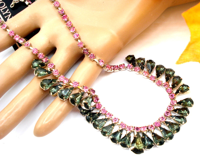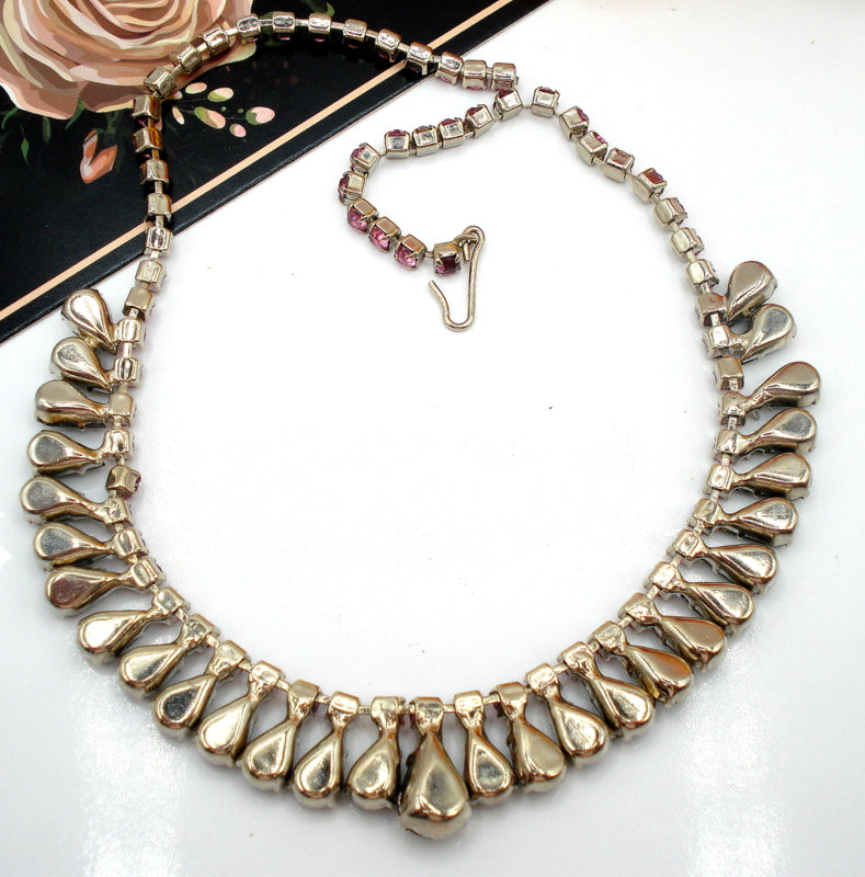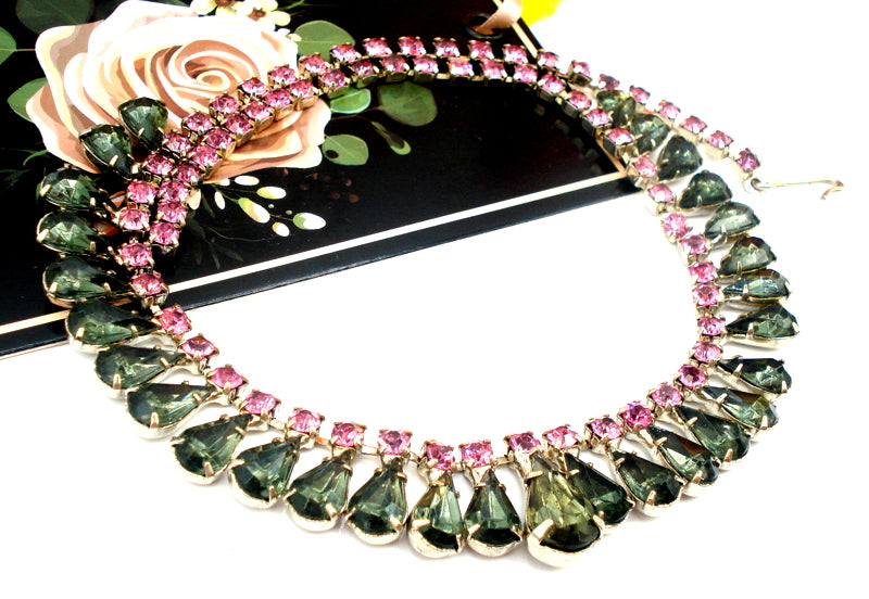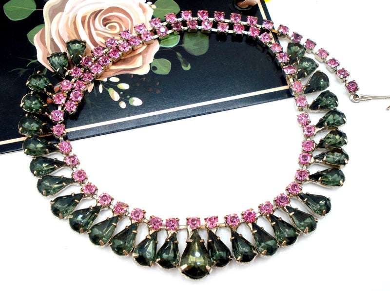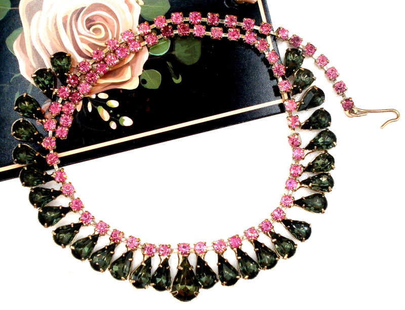 ~Necklace Choker Style Black Diamond Rose Rhinestones. Gold Tone Prong Setting 28 10x6mm Black Diamond Pears 1 13x7.8mm in Center Pink Rose Round Chatons. Hook Clasp. Measures 14-15" x 5/8"