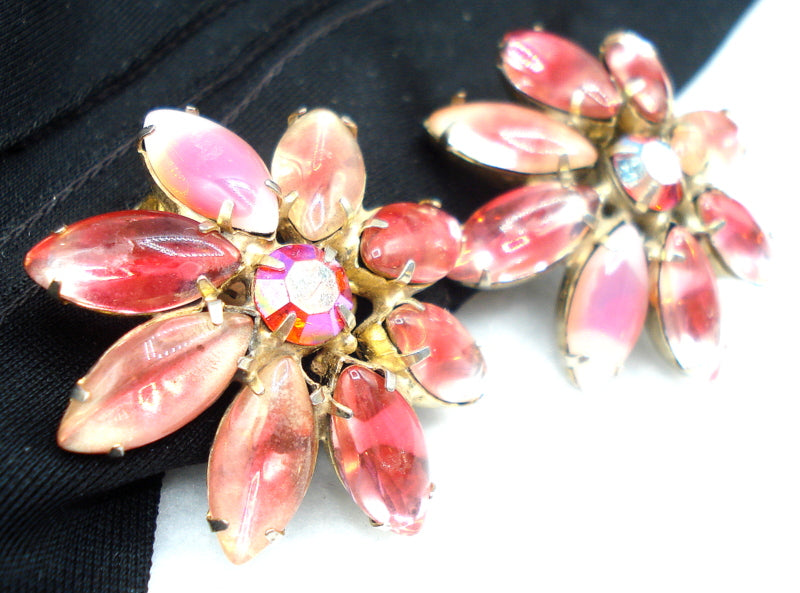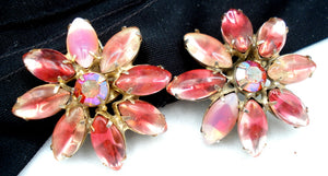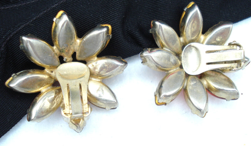 ~VINTAGE 1.5" FLOWER CLIP EARRINGS GOLD TONE PRONG SET RED SABRINA GLASS STONE RED AB RHINESTONES.
