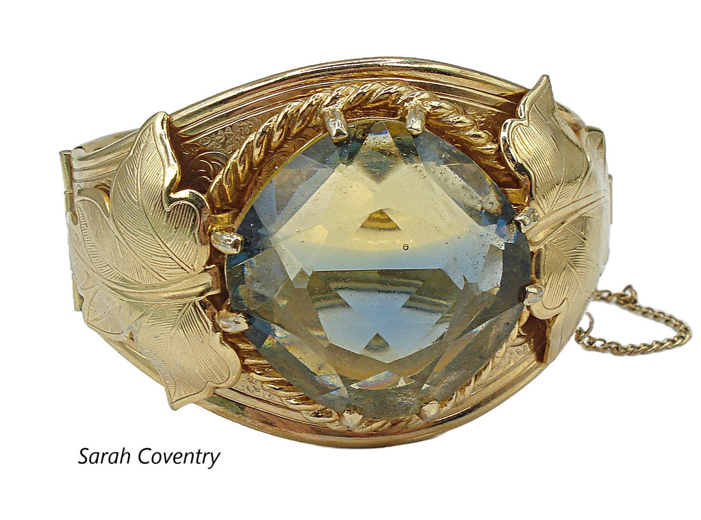 ~Sarah Coventry "Versailles" Hinged Statement Bracelet. 1960's Gold Tone Etched All Around, 2 Embossed Leaves, Large Two Toned Bi-Color Prong Set Unfoiled Rhinestone. Safety Chain. 6.5" circumferance, 1/5" wide center. Very Nice Condition.